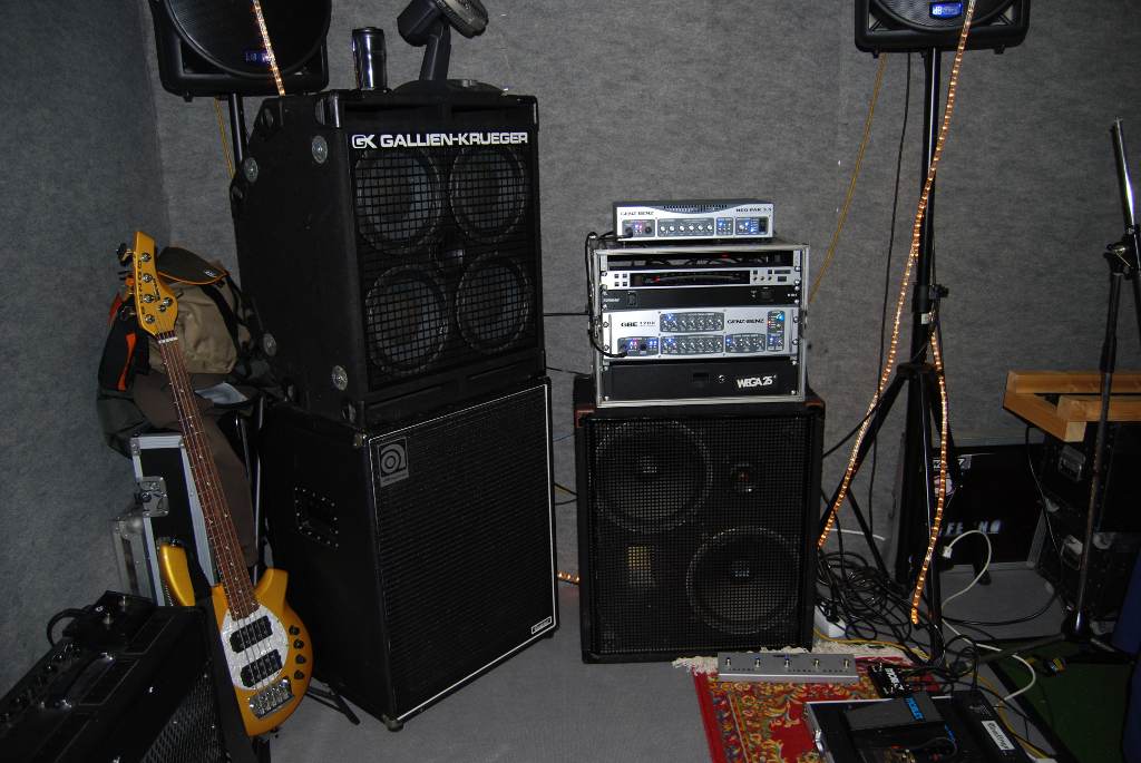 Ich hab hier derzeit ein Genz Benz GBE 1200 + Gallien Krueger 410 RBH + Ampeg 410HLF. Kleines Setup: Genz Benz Neopak 3.5 (auf dem Rack) + Craaft 2x12. Nicht dabei, da derzeit in Reparatur ist der Ampeg SVT-5 Pro.