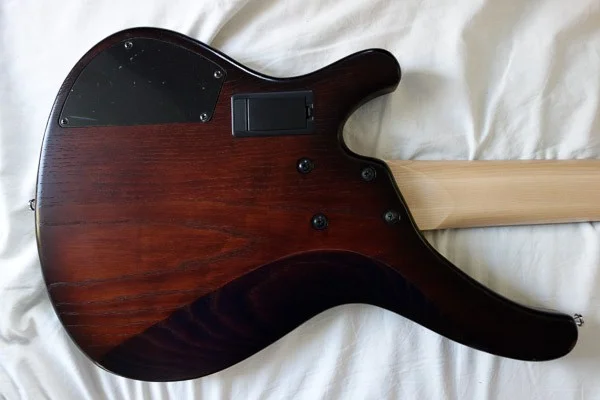 Das Gewicht ist für mich ok, und der Bass ist nicht kopflastig. Wenn ich ihn mit dem Hals auf die offene Hand legen, so dass die Hand in der unteren Aussparung am Korpus anliegt, dann neigt sich der Bass nicht zur Kopfseite, sondern bleibt ungefähr austariert in der Hand liegen. Der Arona gefällt mir auch optisch sehr gut - der natürliche Look des open pore finish, der knorrig-braune Farbton mit sunburst-artig abgedunkelten Rändern, und dazu der Kontrast durch die glänzende Chromhardware und das edle helle Ahornholz des Halses machen den Bass zu einem schönen Möbelstück. Aber das soll ja nicht seine Bestimmung sein