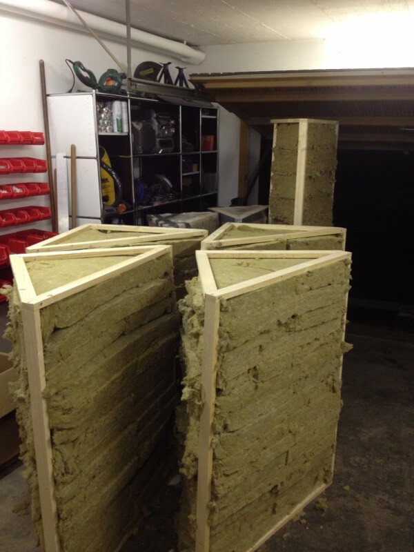Ich habe daraufhin in den beiden vorderen Ecken und in der hinteren linken Ecke jeweils zwei Packungen Rockwool Pakete gestellt, die als Bassfallen dienen sollen und zusätzlich auf den beiden Seitenwänden Akustik Schaumstoff Platten aus Melaminschaumstoff von Basotect mit einer Dicke von ca. 5cm angebracht. In der hinteren rechten Ecke konnte ich leider keine Rockwool Pakete hinstellen, da hier die Tür ist.