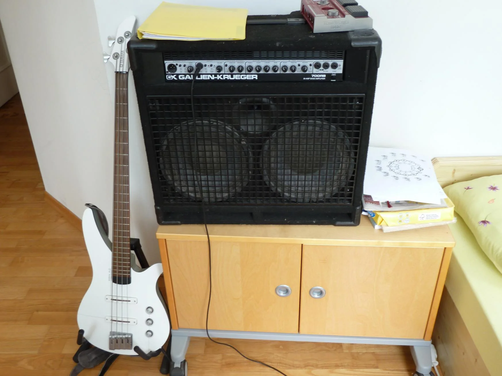 Jau; wer den Bass-Mädel Thread ganz durchgelesen hat, der kennt auch Thoras schwarzen Bass mit weißem Pickguard. Danach kam dann der WW hinzu - und dahinter ist halt ein UltraShortScale Acoustic Bass ... 😉