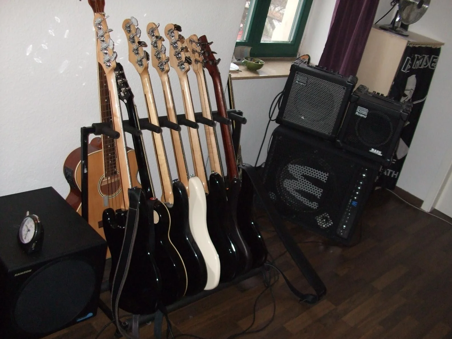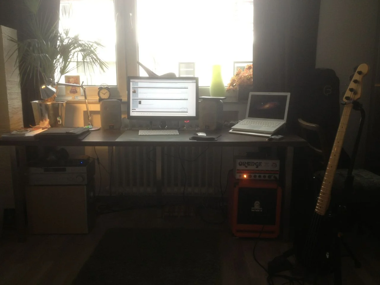 Links auf dem Stereoamp steht das Interface. Der zweit Preci liegt links auf der Couch. Und ja, der Orange mit 500 Watt Leistung und die Box mit 600 Watt Belastbarkeit sind absolut notwendig für ne Mietwohnung! 😉