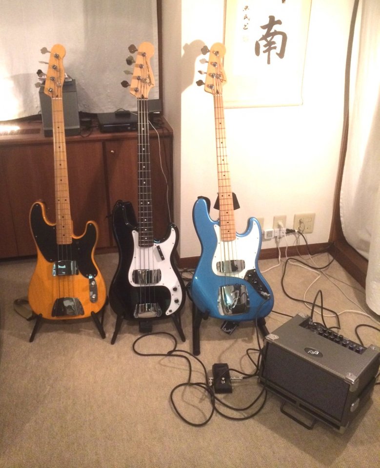 Hier meine Übungsecke, die ich an meinem Zweitwohnsitz in Tokyo unterhalte, die kleine Phil Jones Combo mit 100W ist zwar nicht der Brüller, reicht aber aus, die Nachbarn zu quälen...Eine weitere Übungsecke habe ich in Deutschland, aber leider kein Foto zur Hand, kommt später.