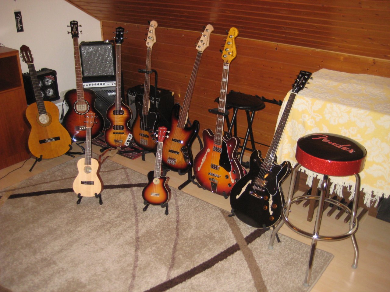 Ich könnte so langsam mehr Platz gebrauchen. Ein Bass und drei Gitarren habens nicht mit aufs Foto geschafft. Aber das wichtigste und meistgenutzte ist zu sehen