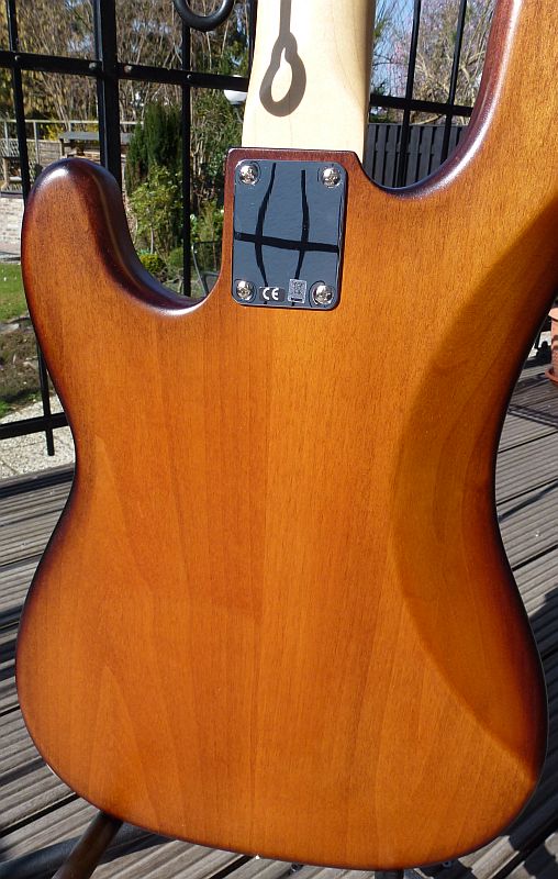 An der Rückseite kann man erkennen, daß der Erlenbody mittig aus zwei Stücken zusammengeleimt wurde. Ich war beim ersten Auspacken schon überrascht, wie leicht der Bass ist, da habe und hatte ich schon ganz andere Kaliber im Keller. Preci war für mich immer gleichbedeutend mit klobig und schwer...letzteres widerlegt die Waage mit knapp 3800g und was das Klobige angeht, so hat man diesem Modell der Thomann-Produktbeschreibung zufolge angeblich einen Hals verpasst, der am Sattel gerade mal 38,1mm breit ist, das wäre ziemlich genau das Maß vom Jazz Bass! Nun...der Hals ist zwar sehr flach und handlich, was zumindest den überrascht, der den klassischen massiven Preci-Prügel erwartet hat, aber er mißt definitiv am Sattel keine 38, sondern satte 42mm. (zum Vergleich: der Ur-Preci hatte fast 45mm Sattelbreite). Diese Abweichung hatte ich zunächst nicht nachgemessen, da mir der Hals durch das trotzdem recht enge Stringspacing tatsächlich sehr schmal erschien und ich es ehrlich gesagt nicht für möglich gehalten hatte, daß es bei den klassischen Eckdaten ernsthafte Falschangaben geben könnte.