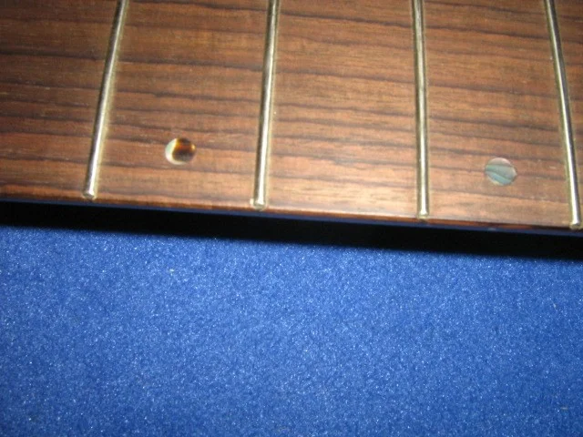 Wo ich gerade beim Hals check war… Bundstäbchen sind sehr sehr sauber eingefasst, absolut keine Aufschneidgefahr und ein Inlay ist mit etwas "Farbe" verschmiert und am Genick ist eine minimale raue Stelle. Naja nicht tragisch, etwas Wachs drüber und der Grossteil war weg, etwas mit dem Schleifpapier drüber und gut wars Anders beim Inlay. Ist wohl doch keine Farbe oder zumindest keine die mit Feuerzeugbenzin wegzubekommen ist. Naja was solls. Stört beim Spielen nicht also auch egal.. Mechaniken gecheckt, da wackelt nichts. Wo ich gerade beim Saitenwechseln war, Brücke gecheckt… alles in Ordnung wie es sein soll. Dann Bass umgedreht und… SCHOCK!!! Wo ist denn das Batteriefach? Ist er letzten Endes passiv?