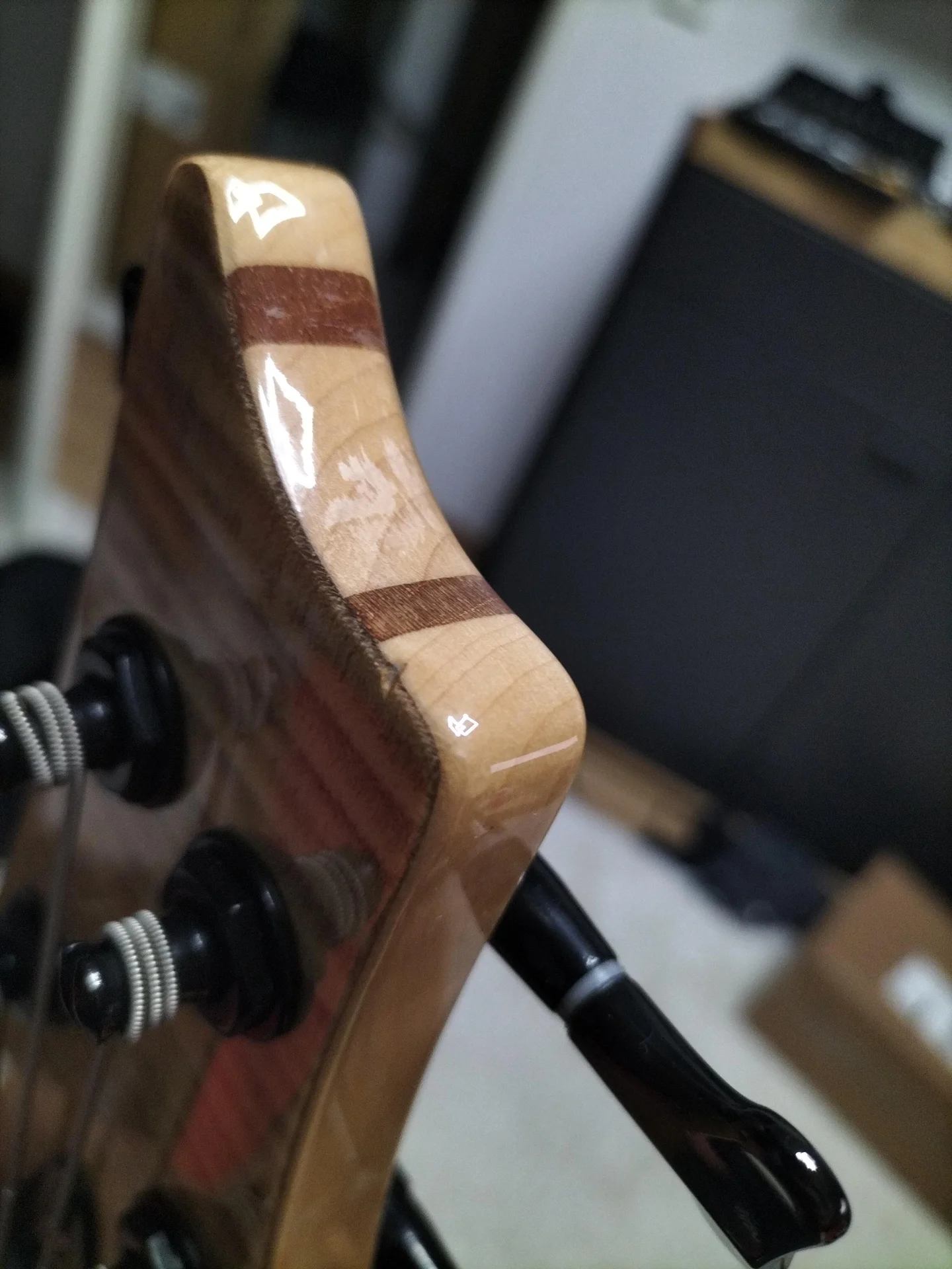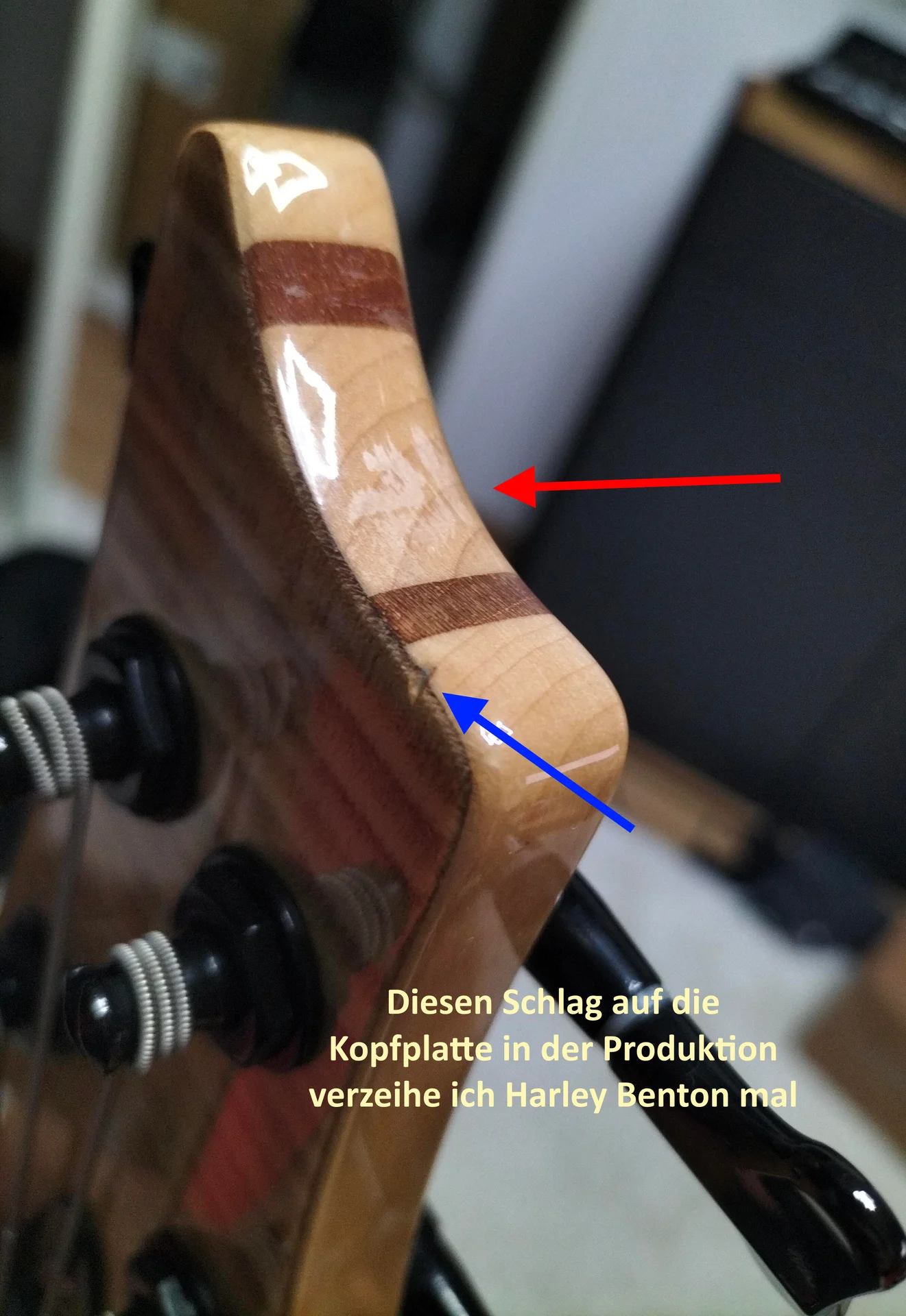 Harley Benton ist bei allen Produkten die ich bisher angespielt habe, immer durch seine gute bis sehr gute Lackierarbeit aufgefallen. So zu 99% auch hier. Nur zu 99%? Also zu 1% nicht? Jep! Auf dem Griffbrett, dick im Sichtbereich, sind von Werk aus diese dicken Kratzer gewesen. Und ja, die fühlt man. Auch war ich relativ erstaunt, dass ich Klebereste(?) an der Kopfplatte vorgefunden habe. Harley Benton? Was ist da los mit euch? Ausgerechnet bei eurem Aushängeschild passiert sowas?