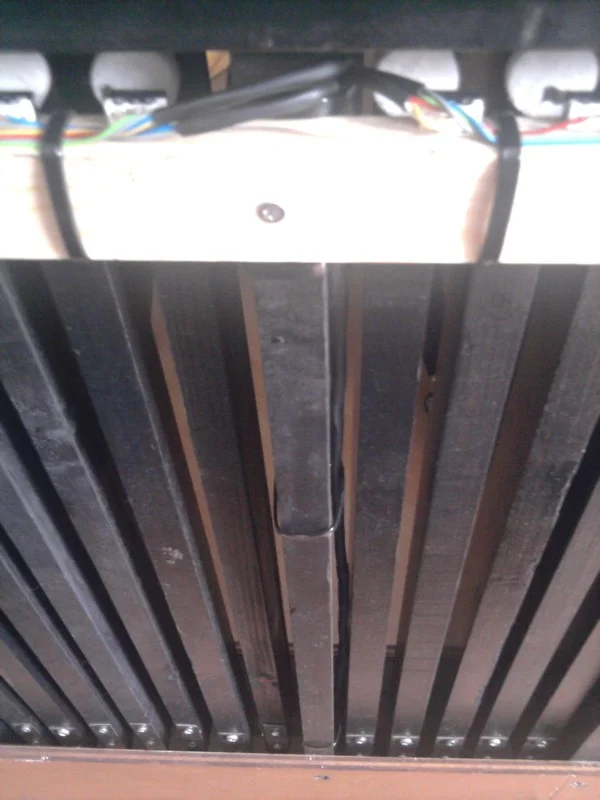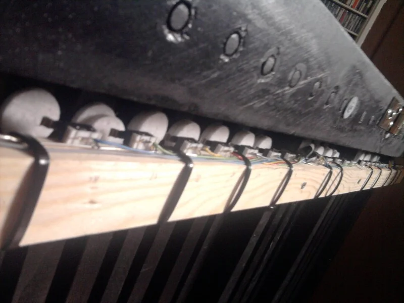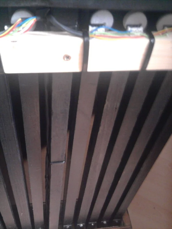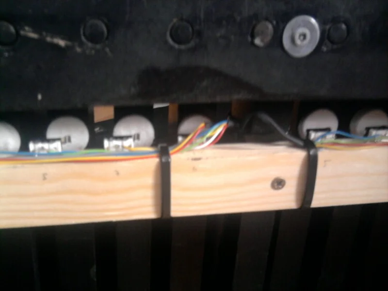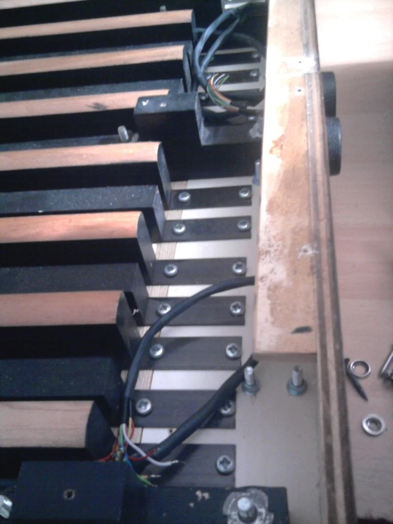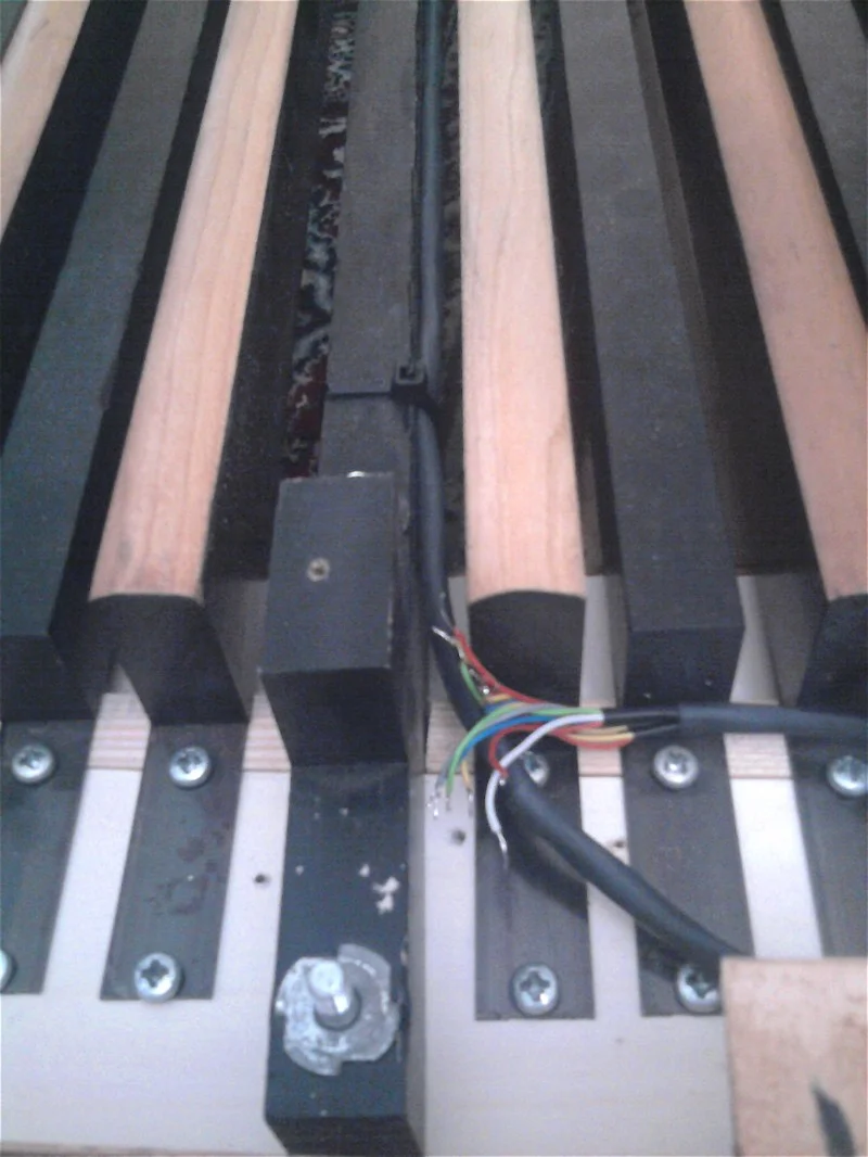 weiter gehts mit dem Pedal: Ich habe die Buchenleisten gegen irgendeine weichere Nadelholzleiste getauscht, die Gründe kann sich wahrscheinlich jeder ausmalen. Trotzdem war die Montage der Schalter mit den winzigen Kreuzschlitzschrauben noch etwas Fummelei. Aber mit einem Nagel vorgebohrt war es dann doch zu machen. Für die Sammelschiene kam versilberter Draht zum Einsatz, für die Schließer ganz normale Litze. Ich habe es so gemacht, dass ich 5 farblich sortierte Fünfergruppen erstellt habe (rot/gelb/grün/blau/grau), von denen eine durch den Klappmechanismus getrennt wird und je eine pro Seite die Sammelschiene (weiß) führt. Der Anschluss ist somit recht einfach und verwechslungssicher möglich, da es auf jeder Seite drei eindeutig zu unterscheidende Stränge gibt und die Reihenfolge der Farben immer gleich ist.