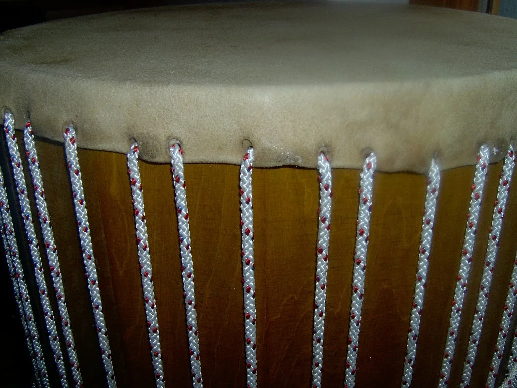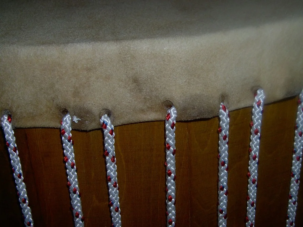 Die beiden Kuhfelle werden über Nacht in Wasser eingeweicht. Am nächsten Tag werden mit einem Locheisen an den im Plan vorgegebenen Stellen Löcher gestanzt. Dabei wird das Fell an den Rändern umgeschlagen und doppelt genommen. So können die Schnüre das Fell nicht ausreissen. Statt dem Locheisen habe ich eine Lochzange (für die Lederbearbeitung) genommen. Das funktionierte bestens. Ein Fell wird auf die Arbeitsplatte (Tisch) gelegt, den Trommelkörper draufstellen, obendrauf das zweite Fell. Kreuzweise gegenüberliegend werden die Felle nun mit 4 Hilfsschnüren gegen Verrutschen gesichert. Nun wird das Seil entsprechend der Anleitung duch die beiden Felle Stück für Stück durchgefädelt.
