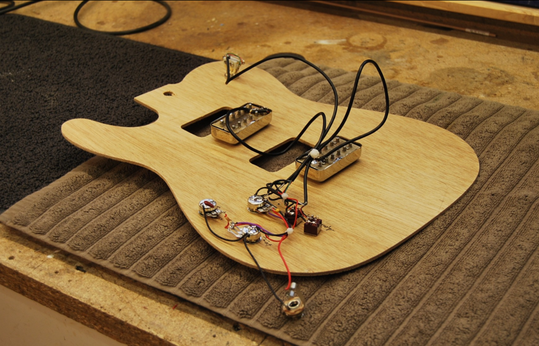 Mit Hilfe einer Deckenschablone wurde die Elektrik bereits zum Einbau vorbereitet. Oben der Toggleswitch zur Pickupanwahl, darunter die beiden TV Jones PowerTron nachempfundenen Eigenbauten, auf der nächsten Ebene dürfte das Volumenpoti kommen mit den beiden Miniswitches zum Splitten der Tonabnehmer. Die nachfolgende hat wahrscheinlich das Basscut-Poti und das Tone Poti. Ganz im Süden hängt noch die Klinkenbuchse.