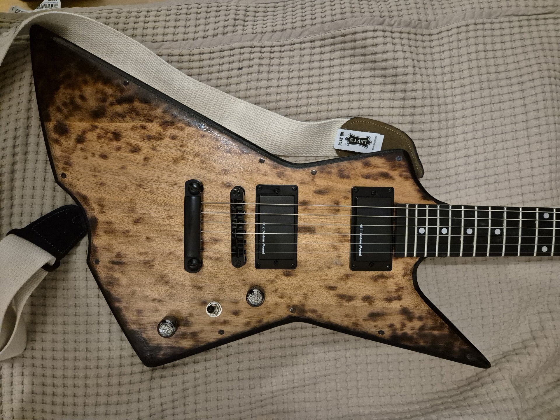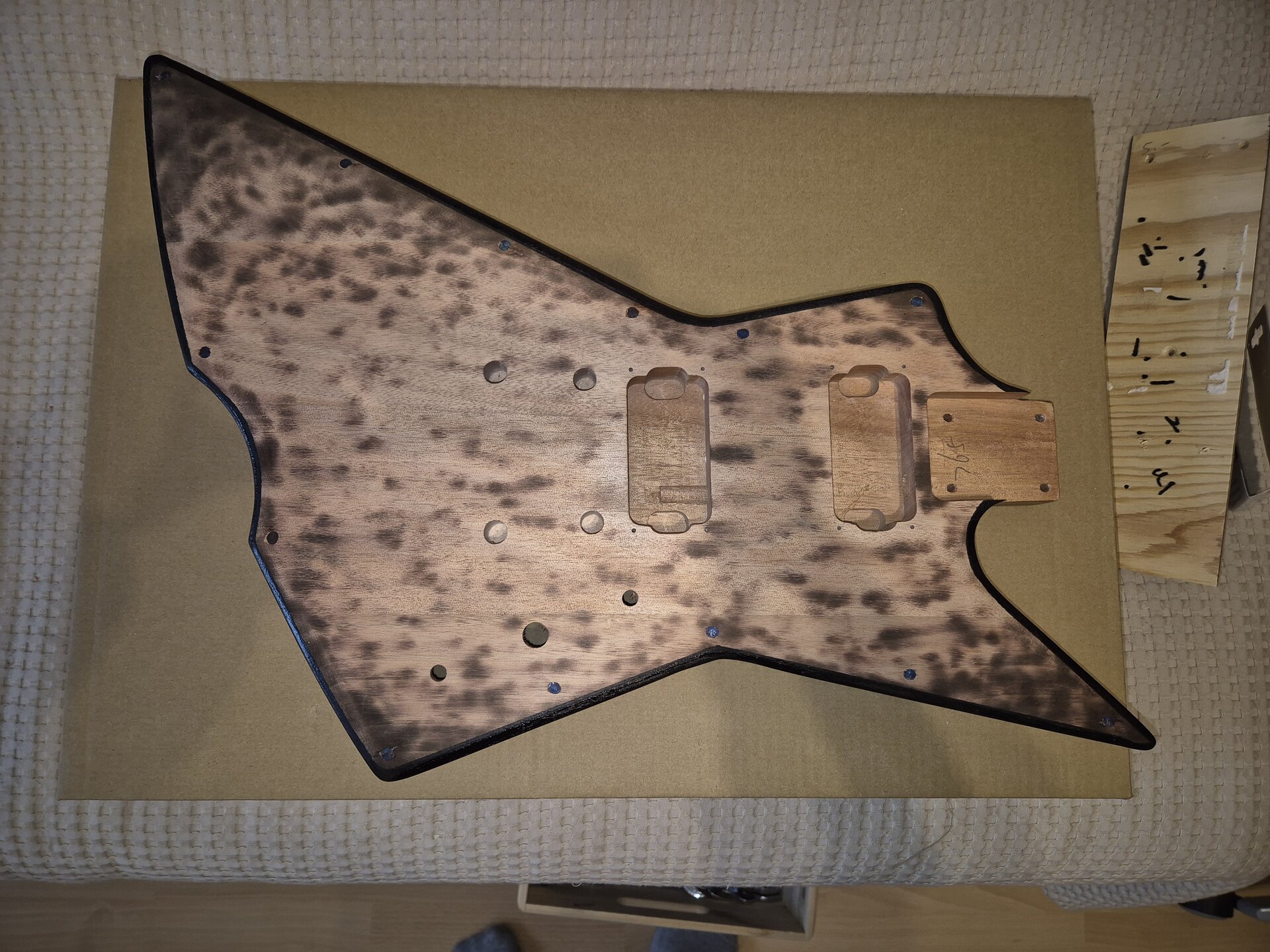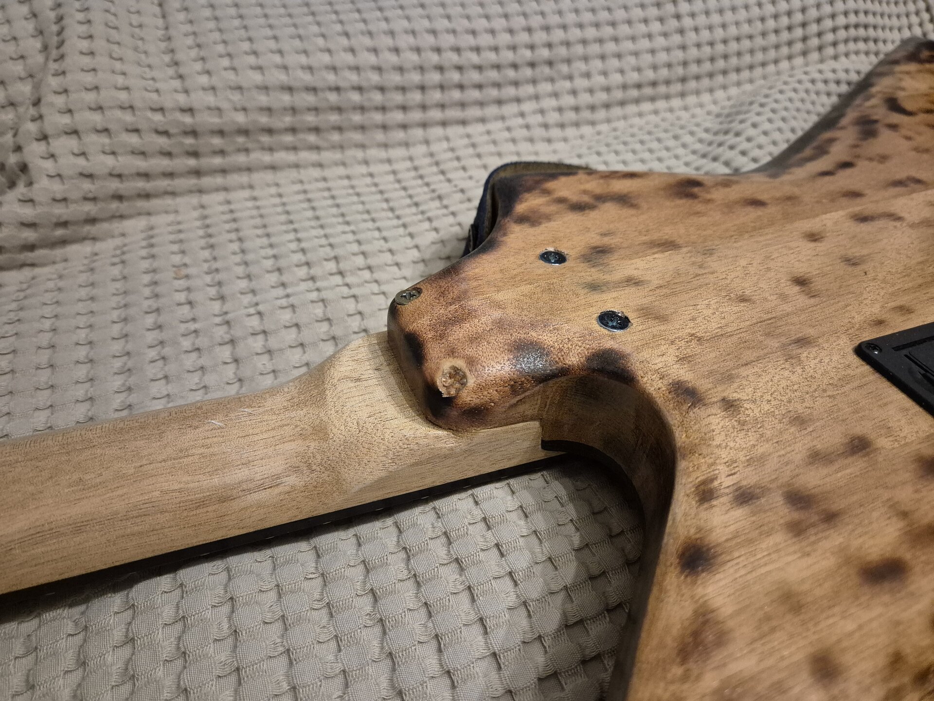 Den Korpus habe ich ergonomisch etwas zurechtgeschliffen, etwas angekokelt und eine Art "Binding" aufgemalt und mit Schellack lackiert. Den Hals habe ich nachträglich eingeleimt. Nicht wegen Hoffung auf besseeen Klang, aber so konnte einen ergonomischeren Übergang zurecht schleifen. Am Schluss dann ein paar schicke Potiknöpfe und fertig ist die Gute. Hier dazu ein paar Bilder.