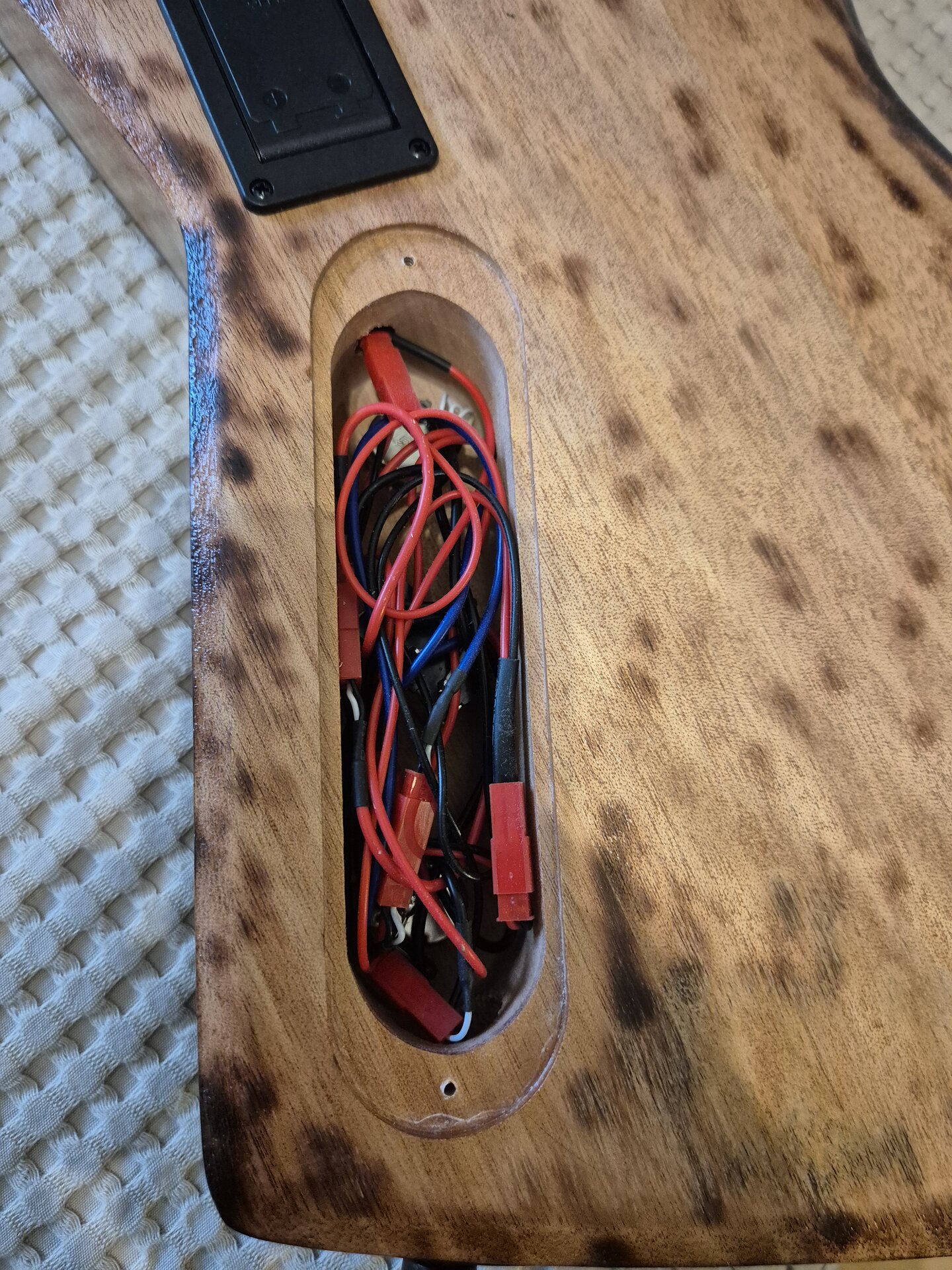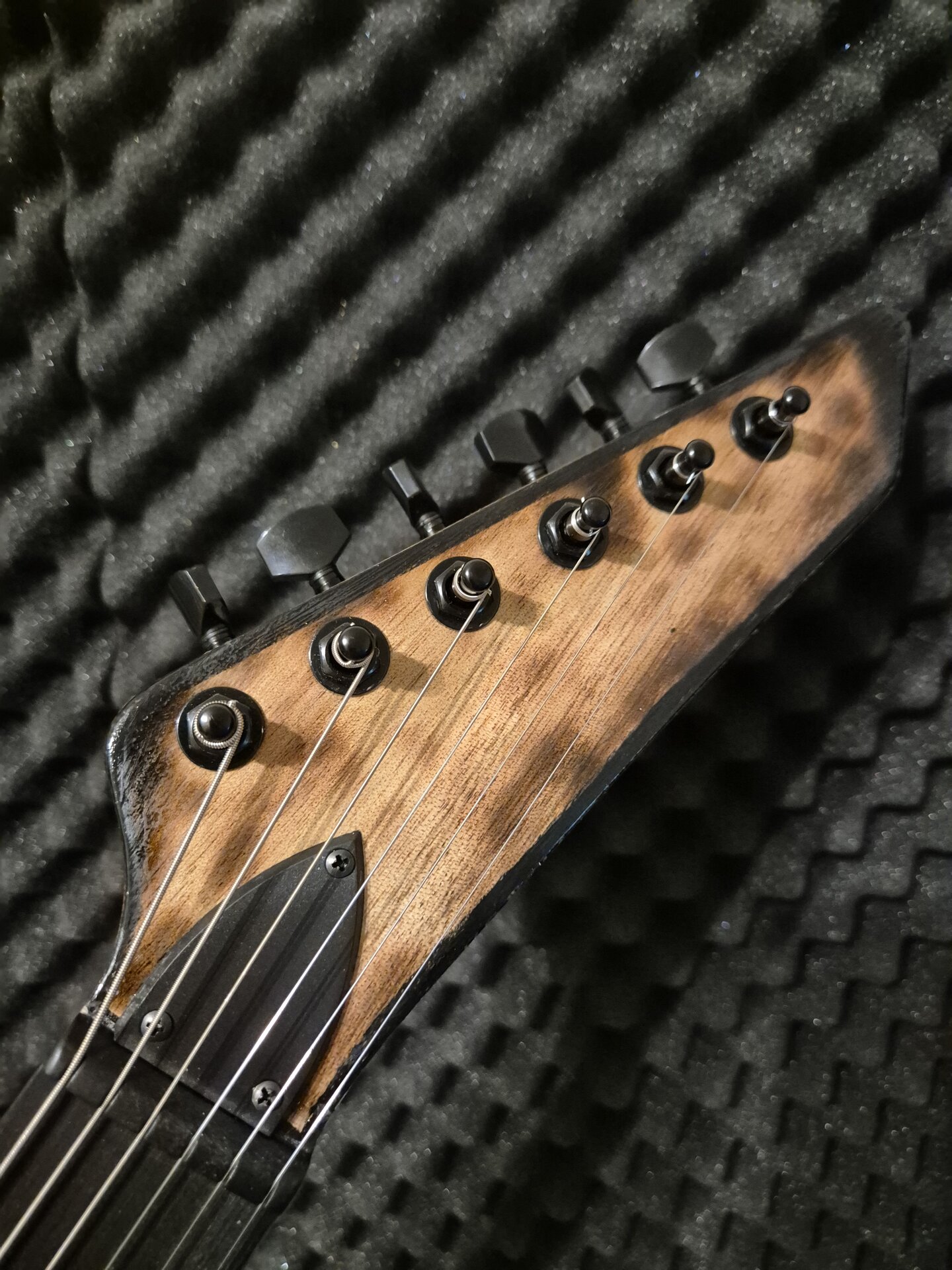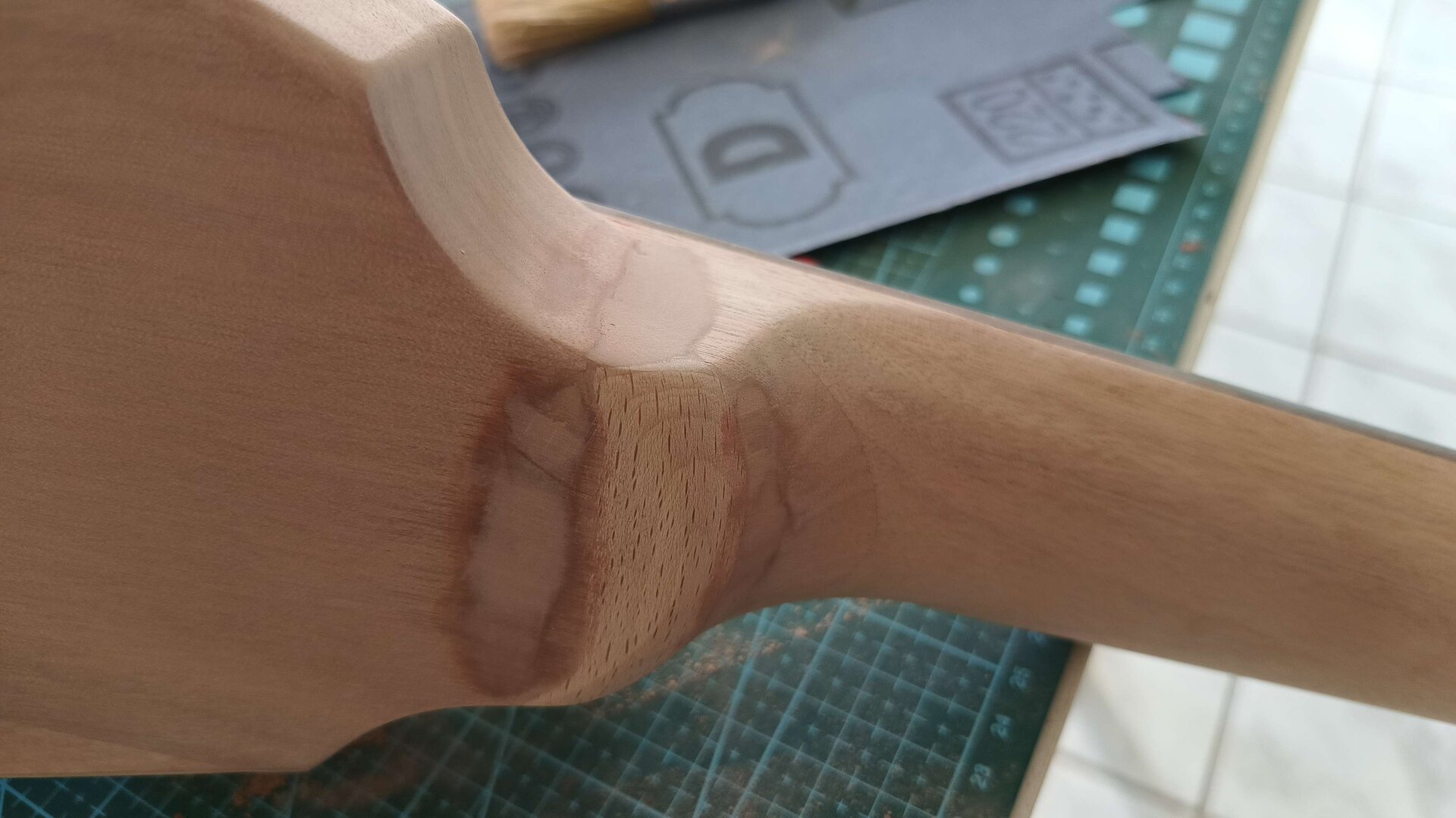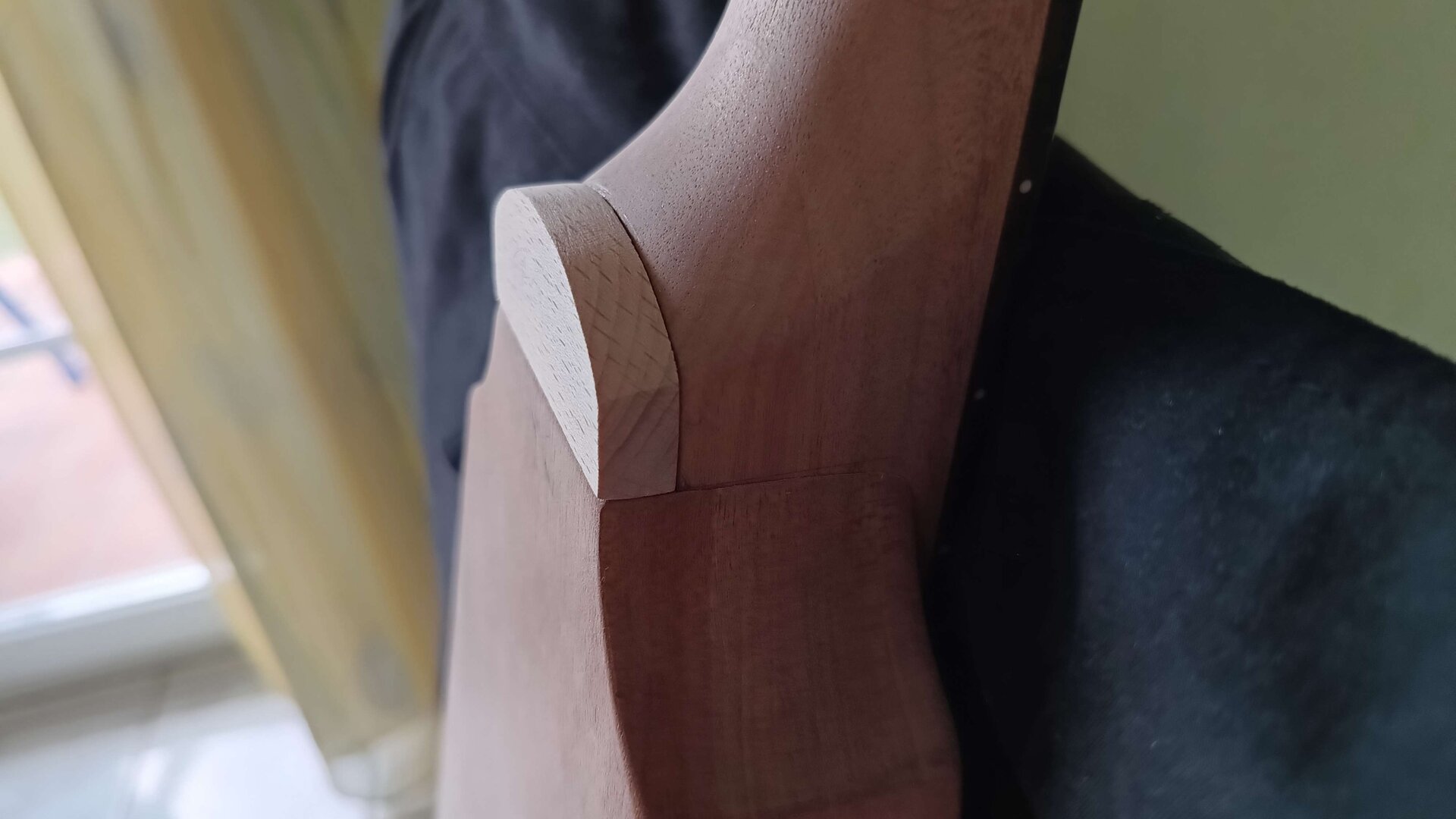 Den Korpus habe ich ergonomisch etwas zurechtgeschliffen, etwas angekokelt und eine Art "Binding" aufgemalt und mit Schellack lackiert. Den Hals habe ich nachträglich eingeleimt. Nicht wegen Hoffung auf besseeen Klang, aber so konnte einen ergonomischeren Übergang zurecht schleifen. Am Schluss dann ein paar schicke Potiknöpfe und fertig ist die Gute. Hier dazu ein paar Bilder.