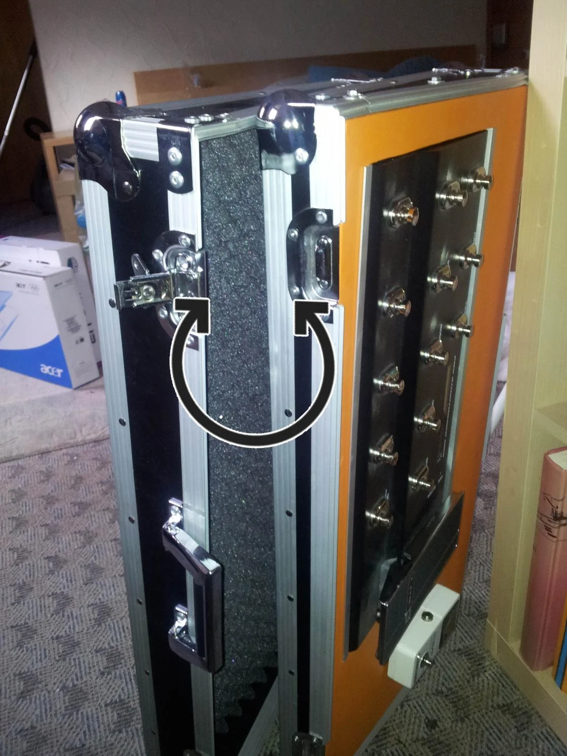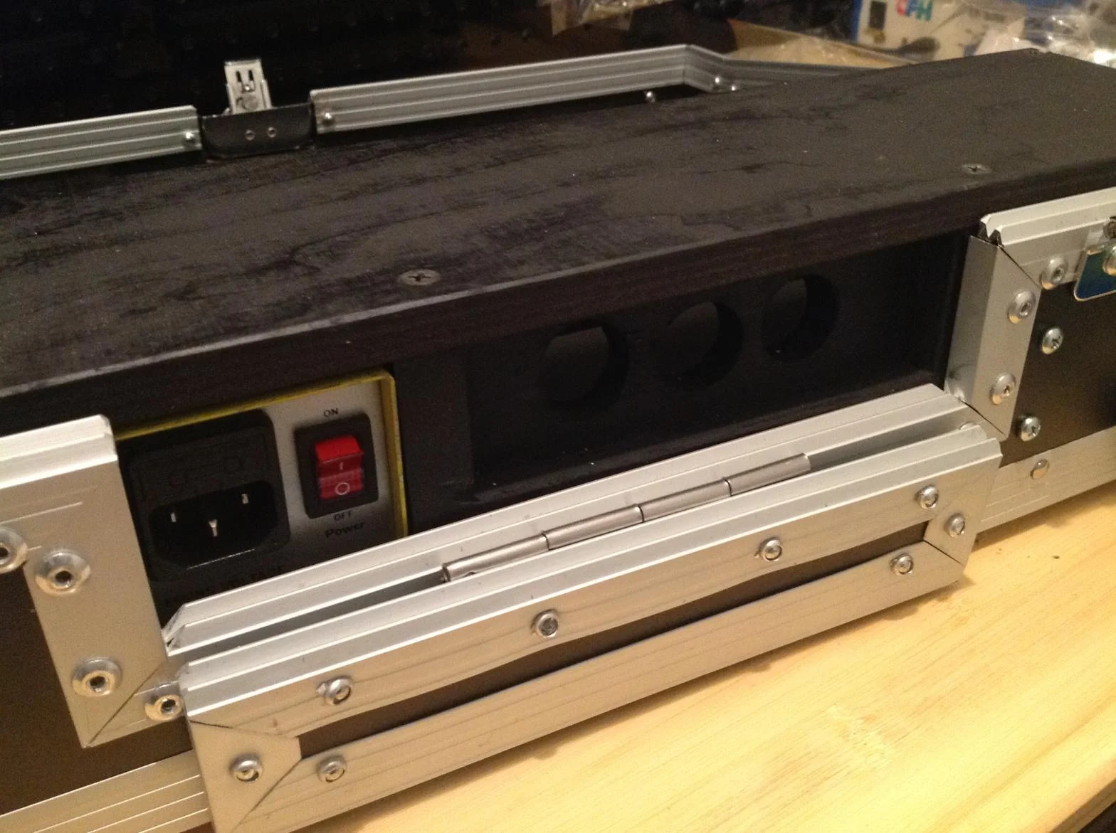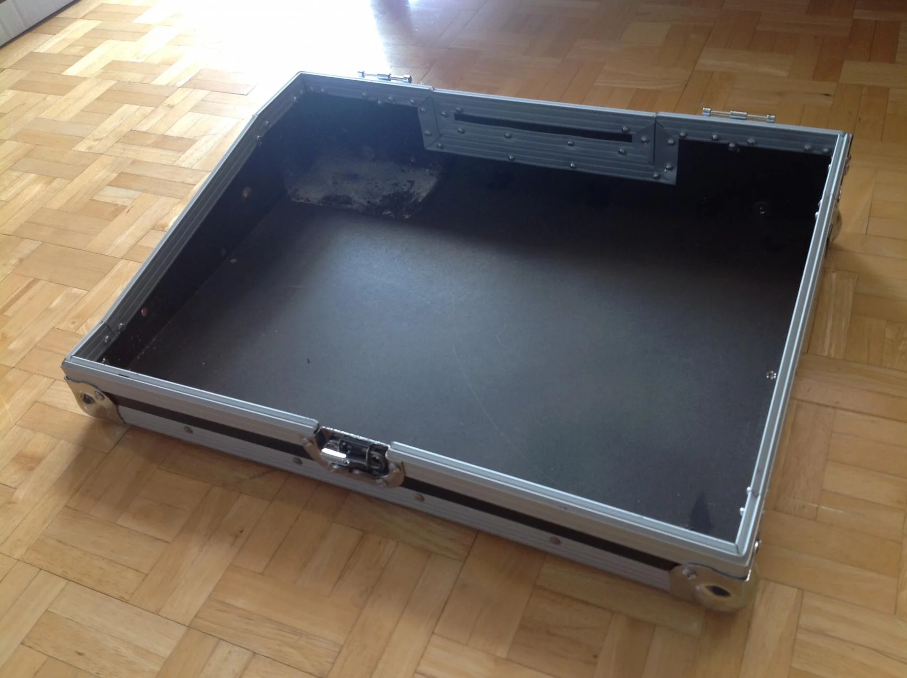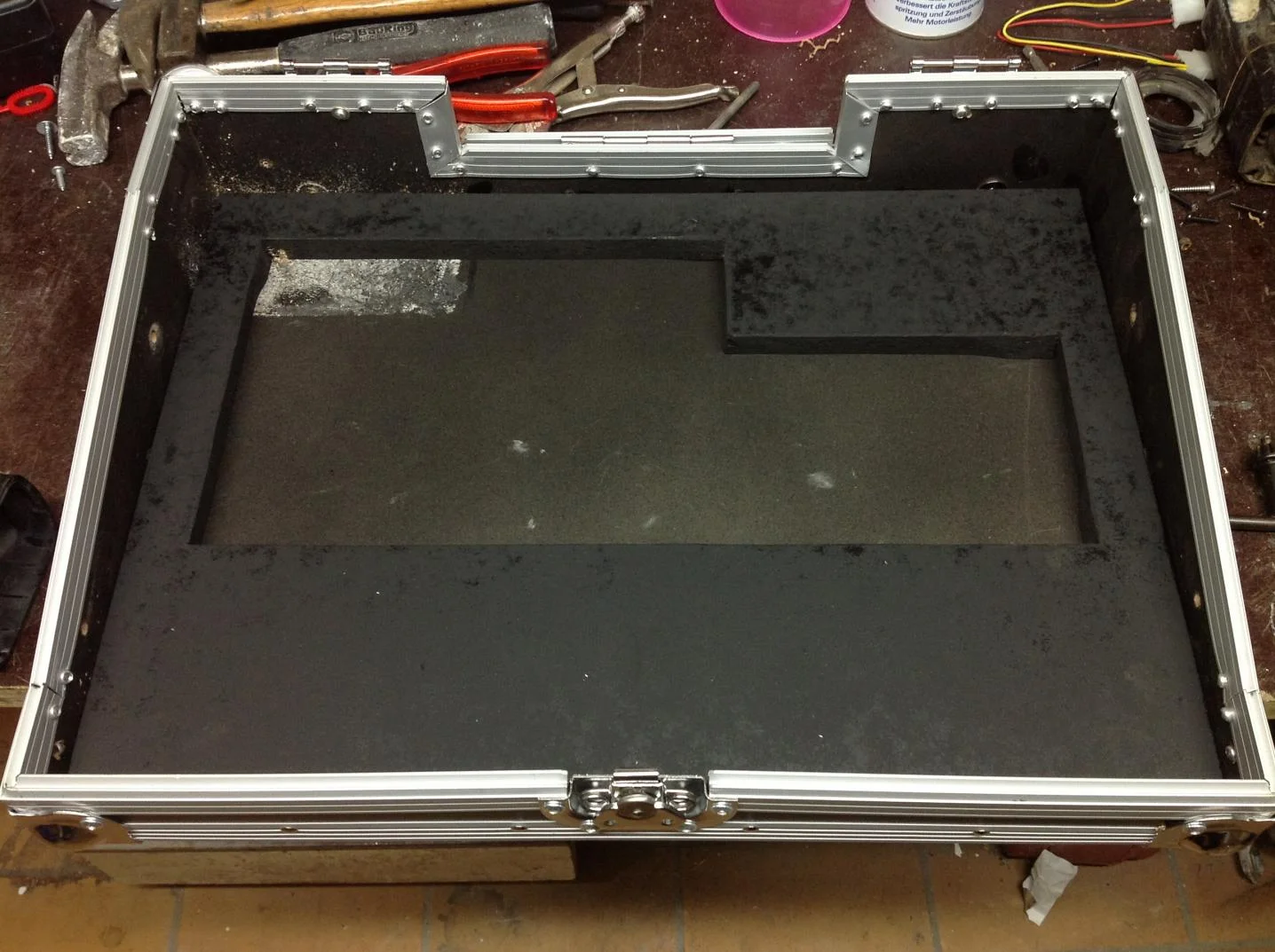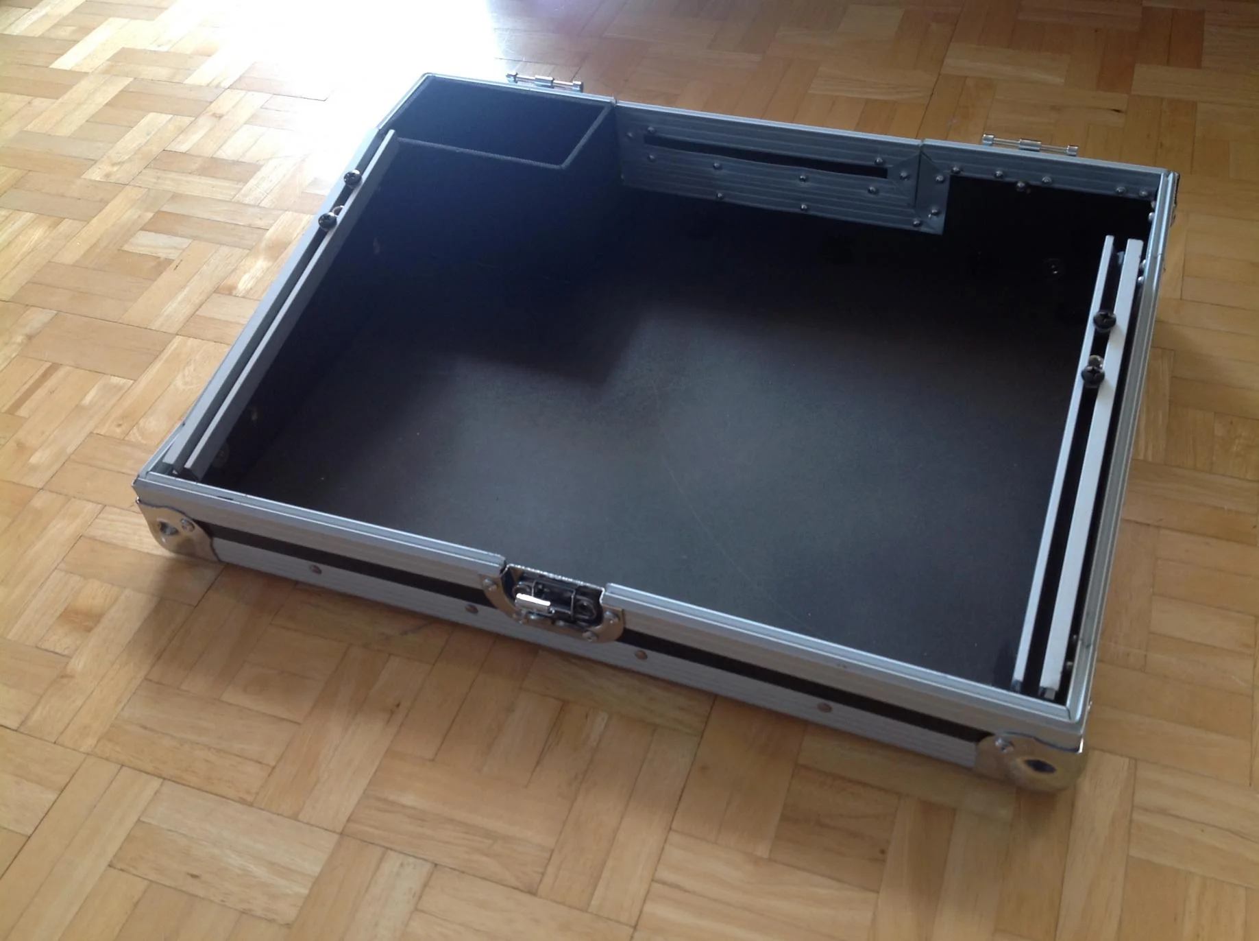 das case im originalzustand besitzt zwei schienen zum befestigen des mischpultes und ein ablagebehäter im oberen bereich.
