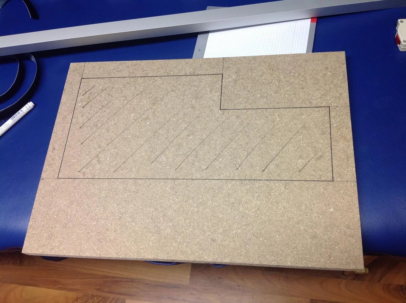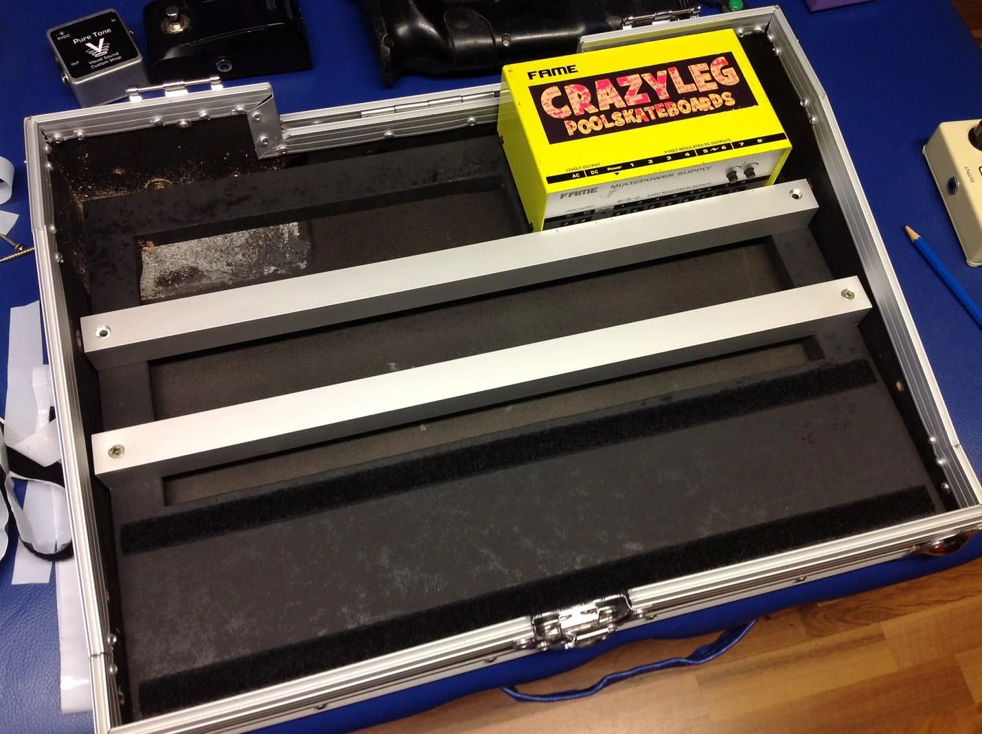 meine idee war es einen zusätzlichen boden als erhöhung einzubauen. und ein stück auszusägen um darauf zwei aluleisten zu befestigen, so wie man das vom pedaltrain kenn.