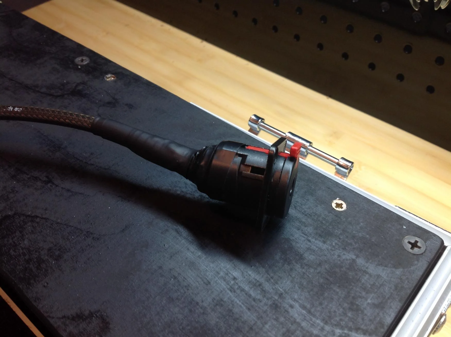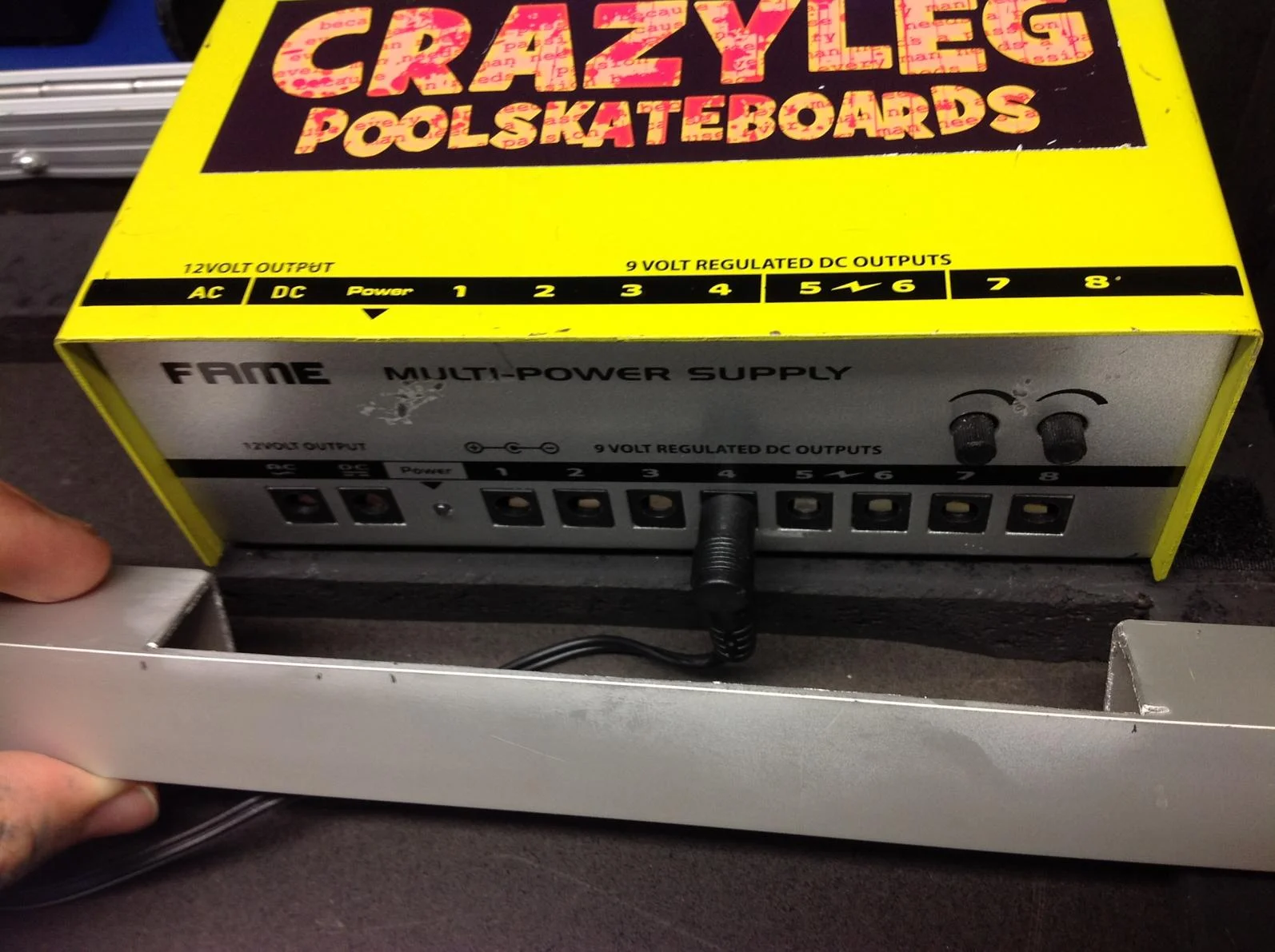 wie man sehen kann werden die anschlussbuchsen des netzteiles durch eine leiste verdeckt. und näher zusammen wollte ich die nicht machen, da sonst die effektgeräte nicht richtig draufpassen würden und keinen stabilen stand hätten. die lösung: ein stück vom aluprofil rausflexen um so einen hohlraum zu schaffen, damit die stecker ins netzteil passen. positiver nebeneffekt: stecker verschwinden vollständig unter dem aluprofil und können nicht durch versehentliches drauftretten abbrechen oder herausgezogen werden.