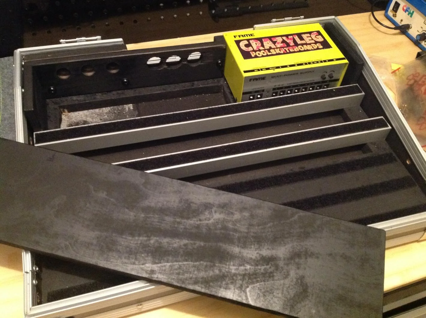 die maße habe ich grob anhand meiner effektgeräte und meines netzteiles genommen, die insel in der mitte ausgesägt und das ganze schwarz angesprüht.