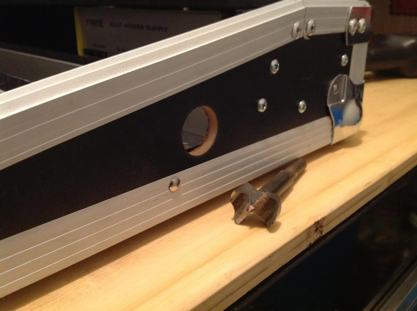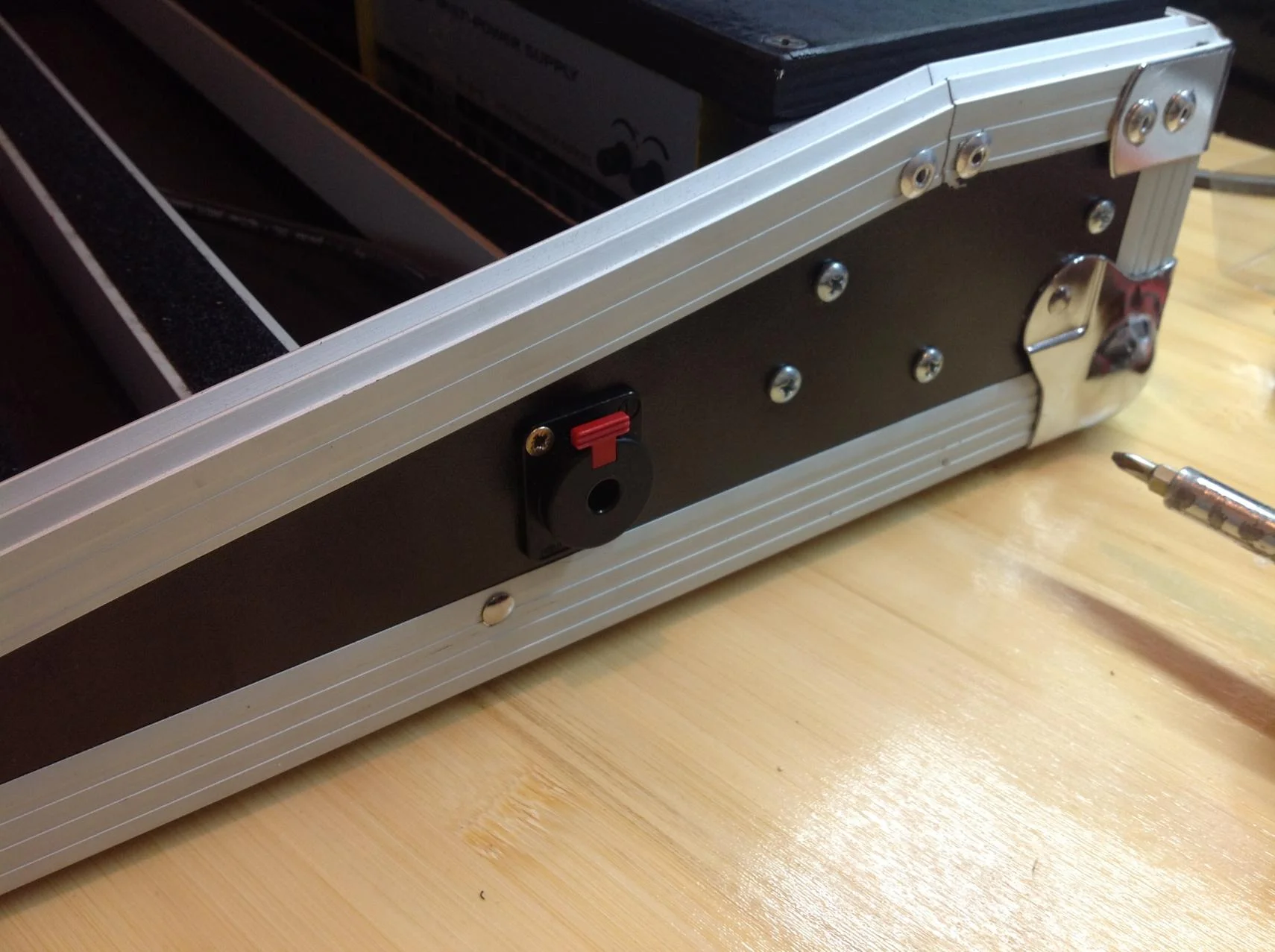 den gitarren-input habe ich bewusst nicht hinten platziert um kabelgewirr zu vermeiden und mit dem anfälligen, ungebufferten signal nicht in die nähe des netzteiles zu kommen. an der seite des cases befand ich das als beste lösund. vorgebohrt ...