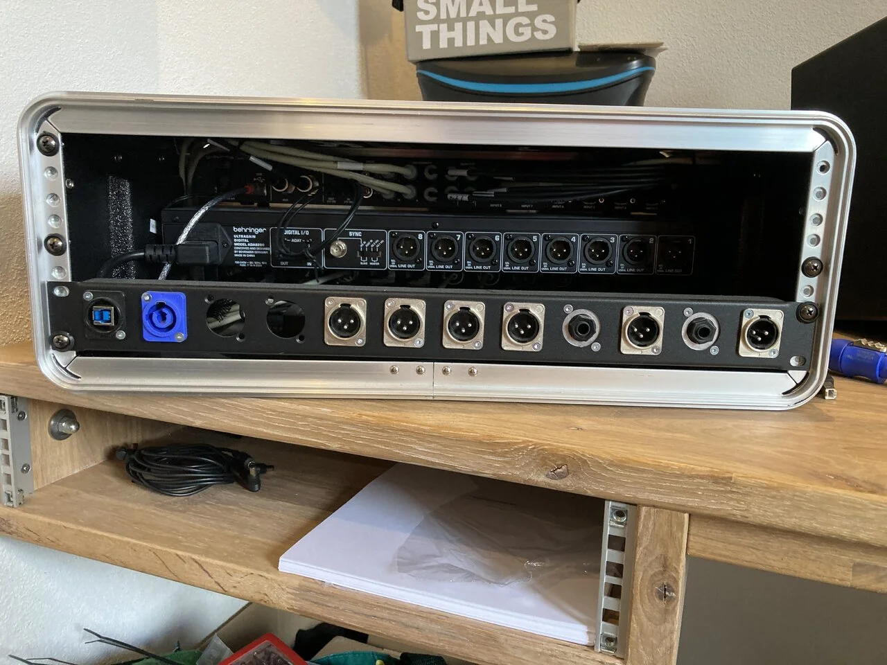 Die UMC1820 Soundkarte hatte ich noch, damit gings los mit den ersten Experimenten via Mono IEM Mix. Die ADA8200 Erweiterung via Toslink lag zu der zeit bei 170€, 3HE Gator Rack war auch noch eins im Keller…