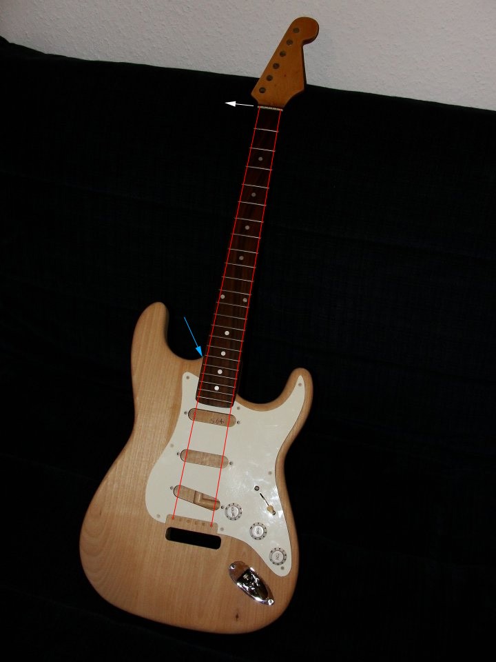 Als Hals habe ich auf dem kölner Musikerflohmarkt ein Teil im Strat-Stil (mit RW-Griffbrett) für erwerben können. Kostenpunkt: 9 €! Der Hals liegt gut in der Hand, fühlt sich hochwertig an und hat eine tolle Griffbrettmaserung (siehe Foto)! Die Kopfplatte werde ich noch etwas zurechtsägen müssen, damit sie eher nach Strat aussieht (gewschwärzter Teil auf dem Foto kommt weg!). Leider sind die Mechaniklöcher auf 10mm vorgebohrt, somit fallen Vintage-Mechaniken schon mal flach!