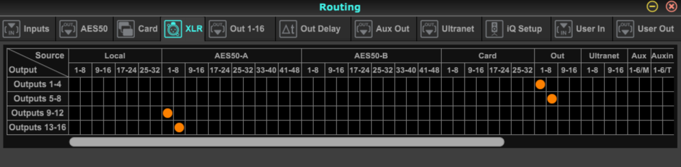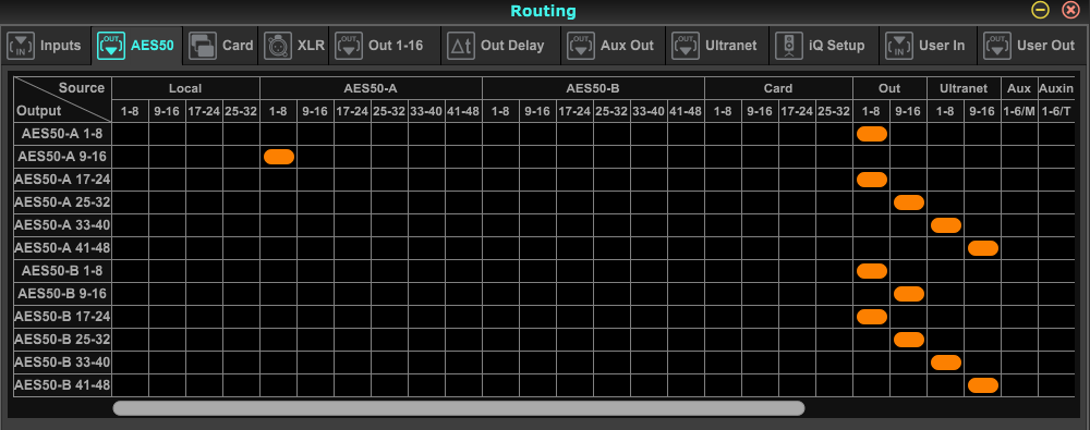 Der Plan ist jetzt, mit einem SD8, dass wir mit ins Rack eingebaut haben mehr Outs zu bekommen um die Sender damit zu versorgen. Wenn ich das richtig verstehe schließe ich jetzt das SD8 per Netzwerkkabel über das AES50-A an das X32R an. Jetzt zu meiner eigentlichen Frage, wie bekomme ich jetzt die Outs 9-16 an die Outputs des SD8? Ich hab leider keine Szene die ich hochladen kann, soweit war ich auch noch gar nicht. Aber ich habe einen Screenshot beigefügt wie ich nach meinem Verständnis das Routing im X32 einstellen müsste, damit ich die übrigen Mixbusse für den Monitor auf die Outs des SD8 bekomme.