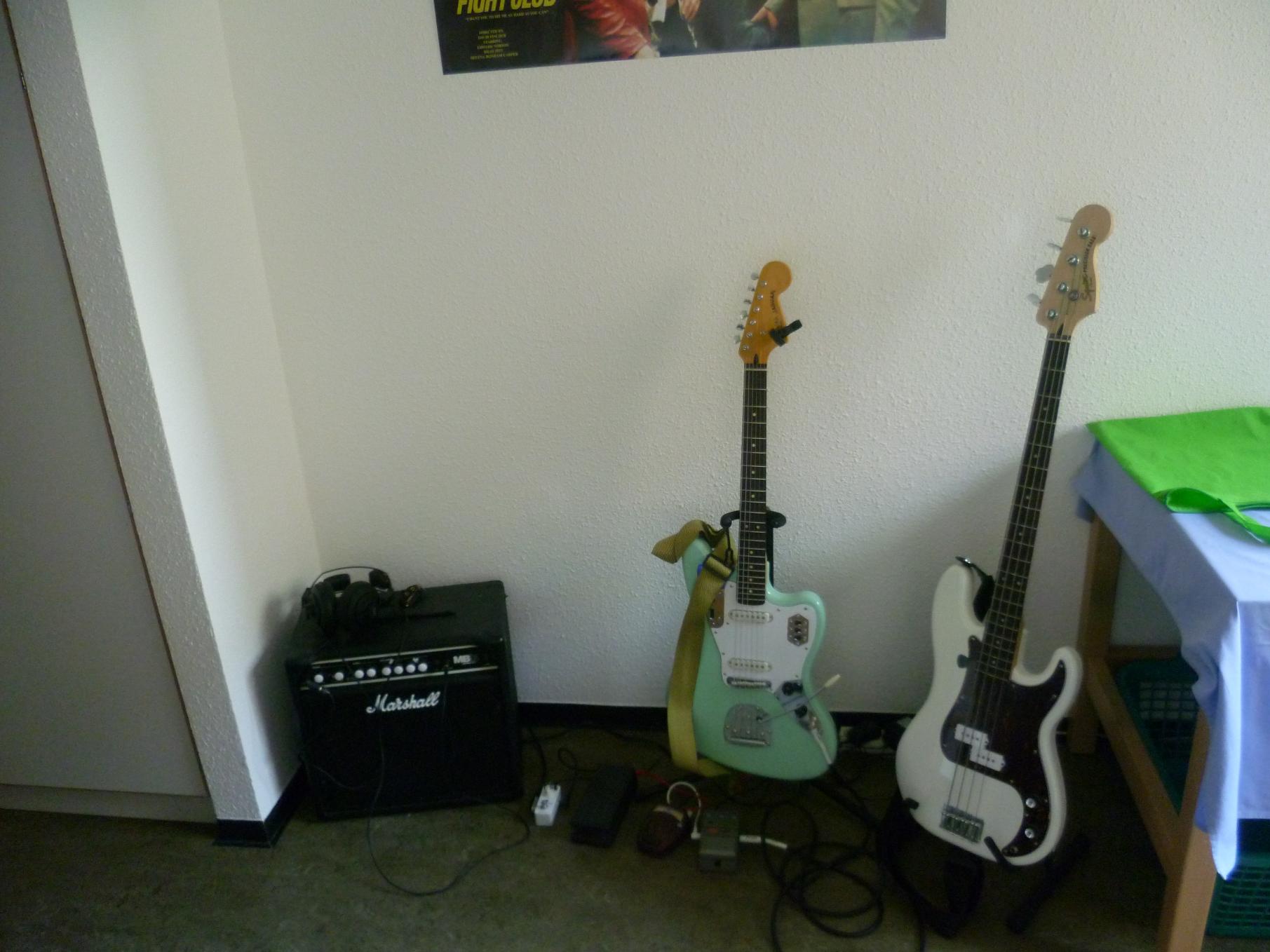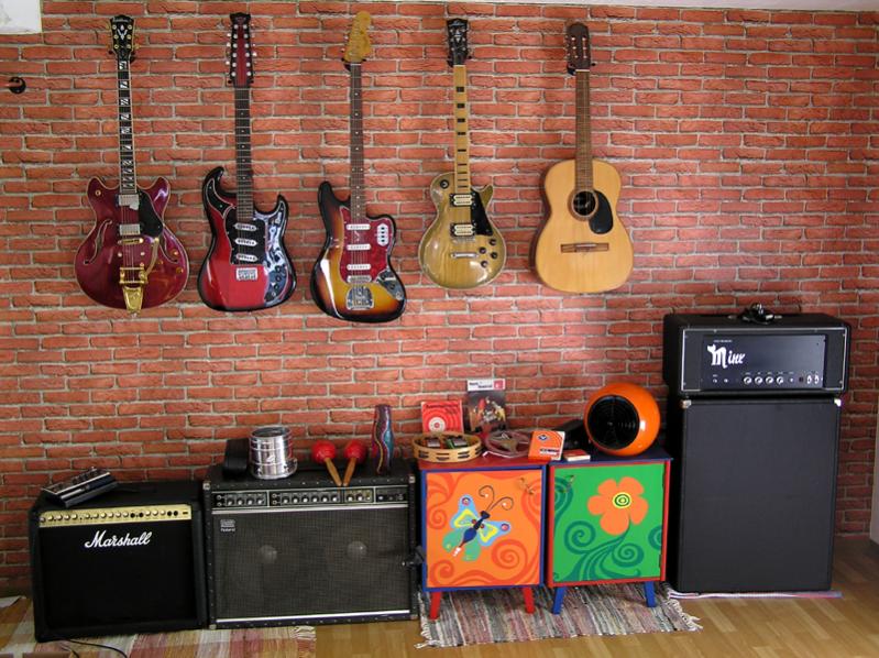 Gute Mischung an Klampfen. Ist die Wand eine Tapete? Sieht sehr stylisch aus