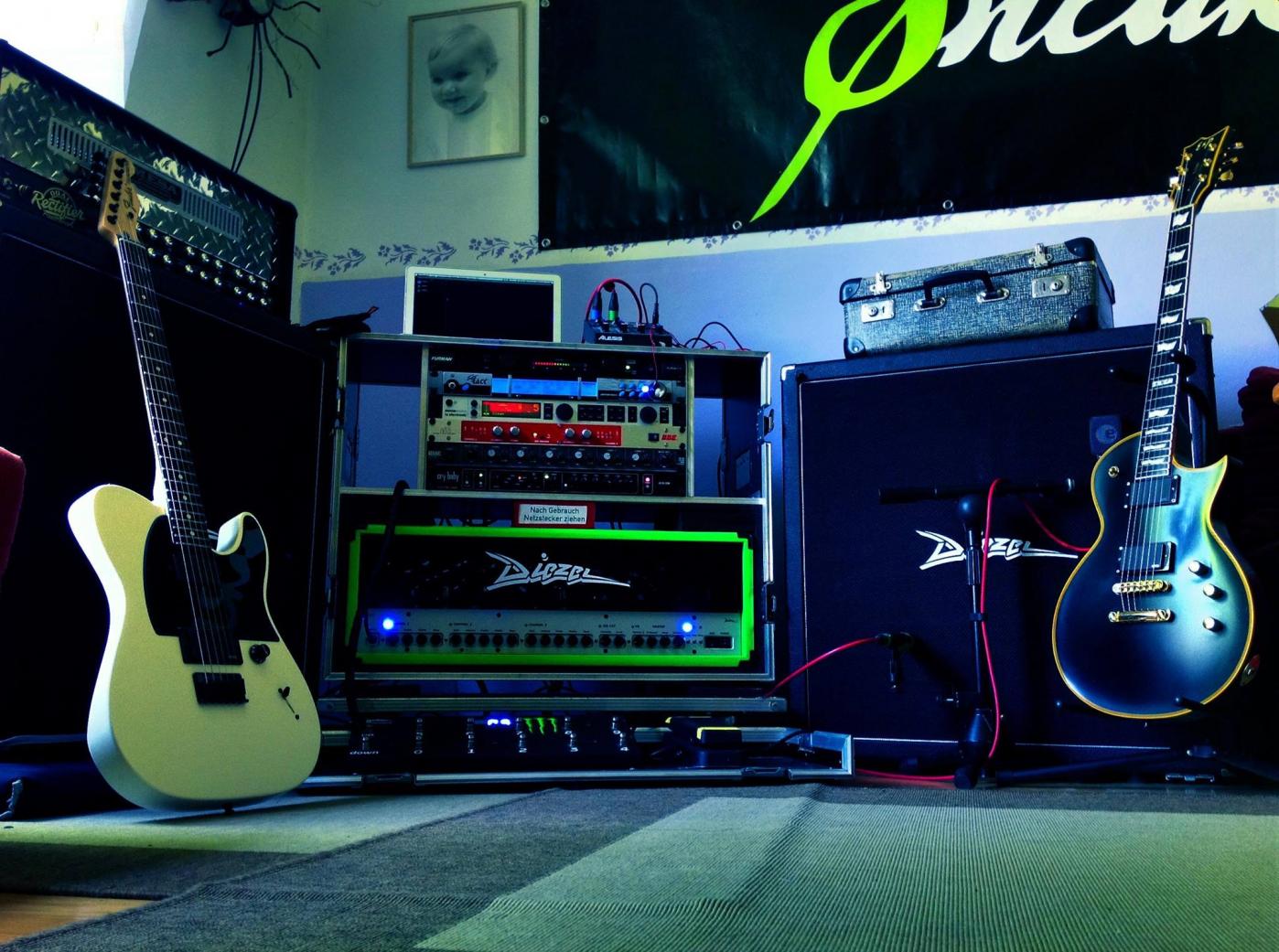 Von den ersten Gehältern meiner Ausbildung bekam ich dann meinen 76er Marshall JMP. Komplett blind gekauft aus ebay von MJ Guitars in München, klingt aber zum Glück genial und ist mein bedeutsamster Amp! Das 85er Cab hab ich für nen guten Preis von meinem ehemaligen Gitarrenlehrer bekommen. Außerdem suchte ich noch eine Gitarre, welche meine QTX als Lern/Mitschleppgitarre ablöste....das wurde dann die rote Rockinger-Partscaster, war gut:) wieder ca. 1- 1/2 Jahre später sah es dann so aus.