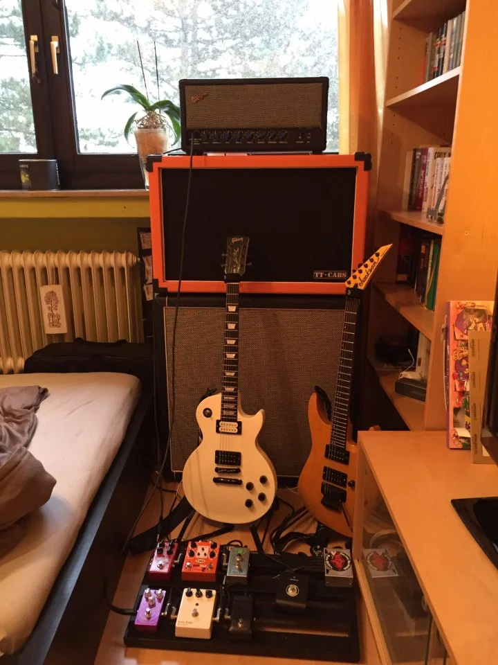 Och..achja, ich spiele eig. nur über den Laney - der geht direkt in mein Interface und von dort in den PC. Per Guitar Rig Pro 5 kommt dann 'ne Cab-Sim oben drauf - spart mir'ne Menge Knete ;-)