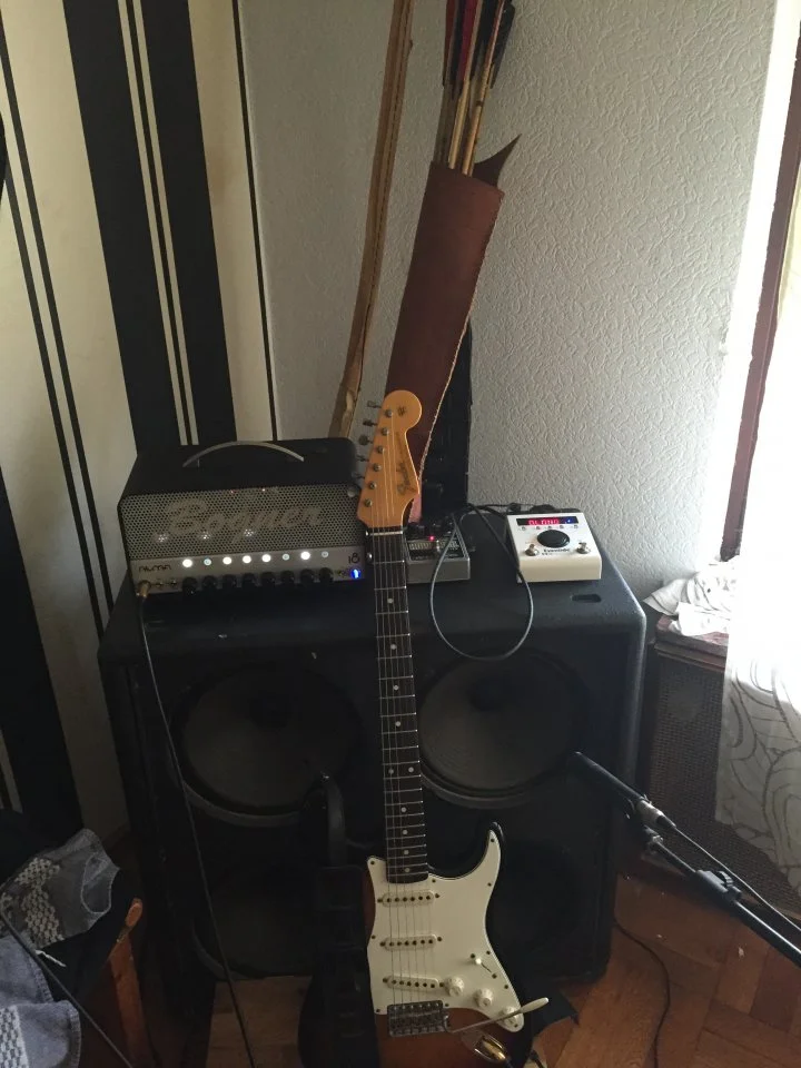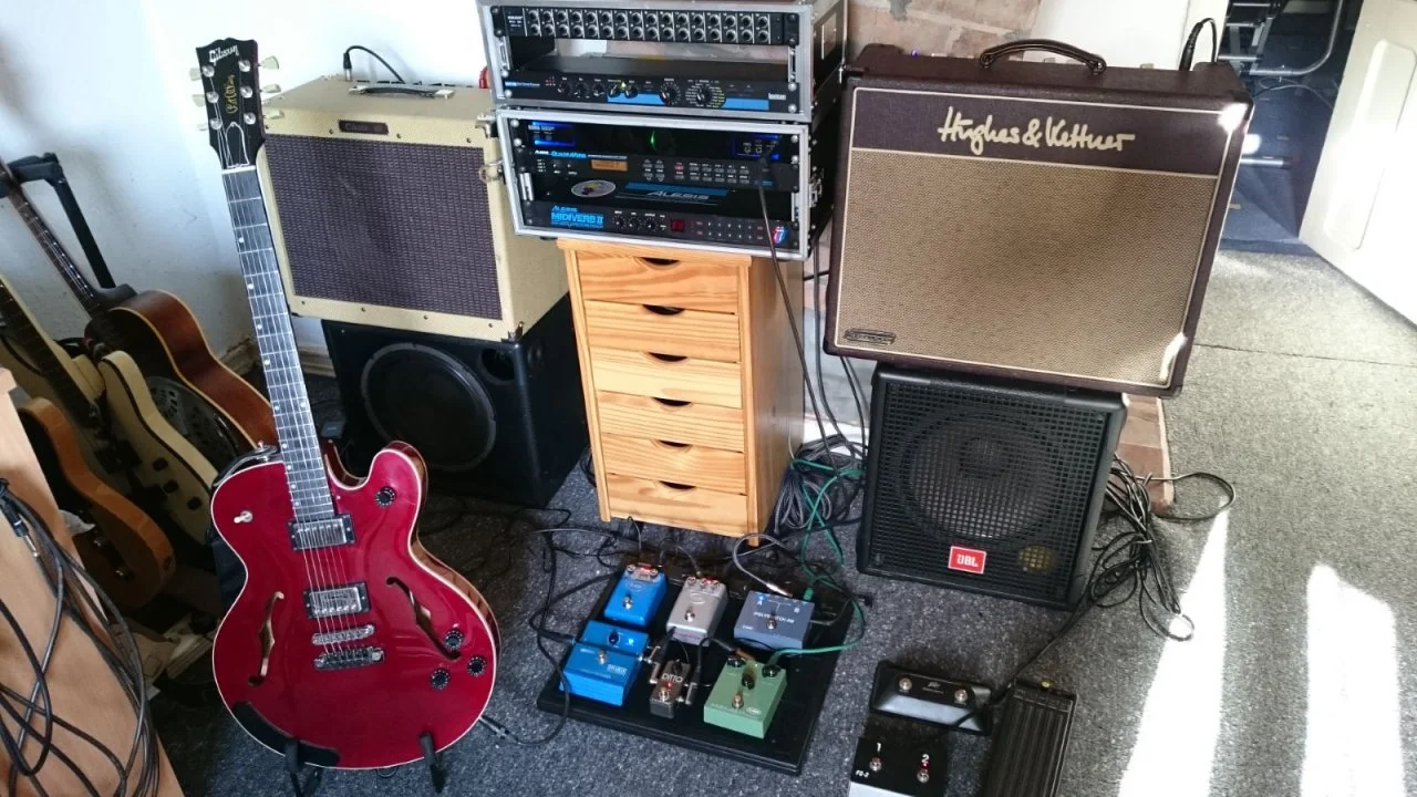 Im Proberaum befeuert der Orange dann eine 4x12er von Marshall.