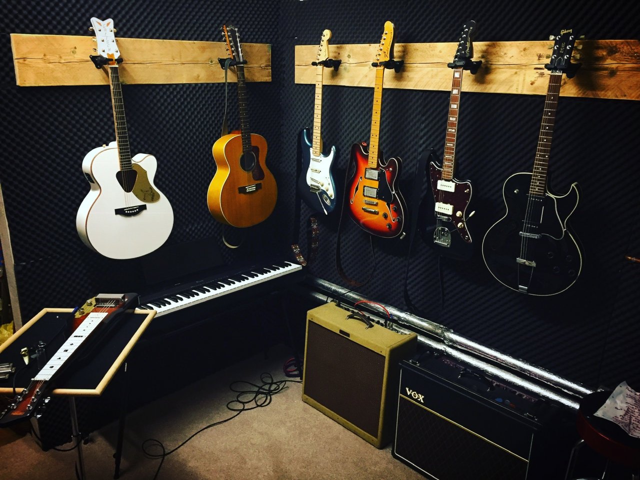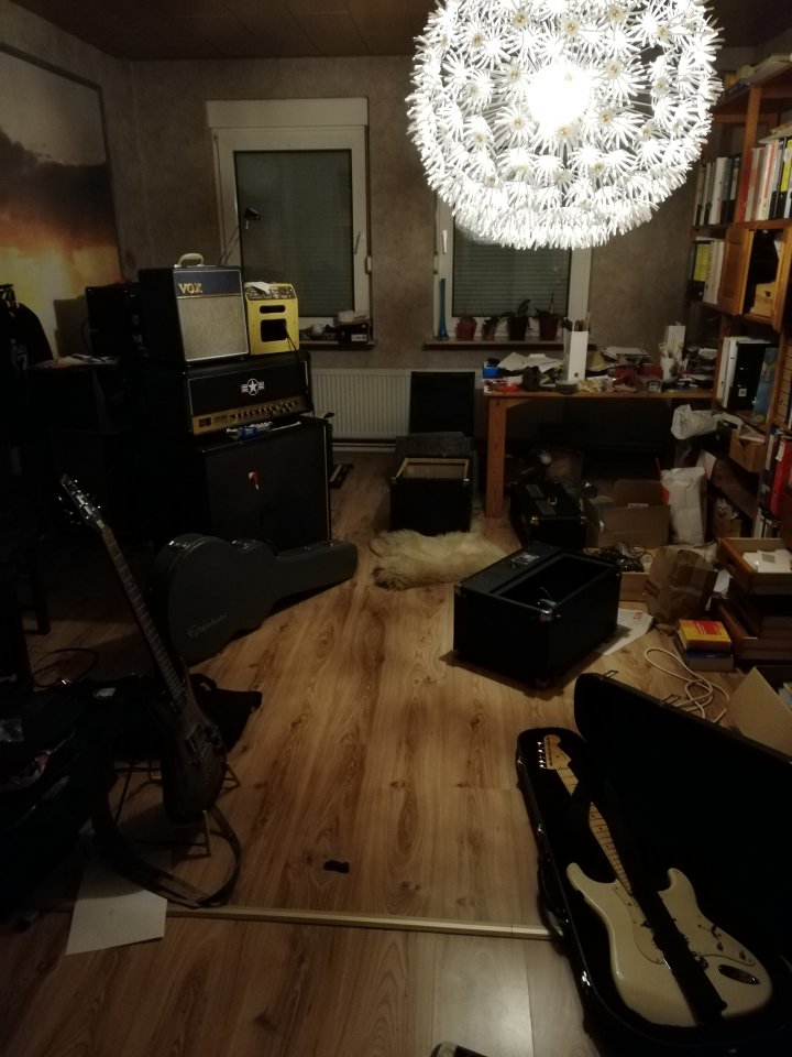 Deine Gitarrenauswahl ist ebefalls KlasseDa das nicht für immer mein Musikraum bleiben wird/kann, wollte ich halt, dass die Halter alle gleichzeitig abnehmbar sind. Einfach ein altes Brett genommen und los ging es.