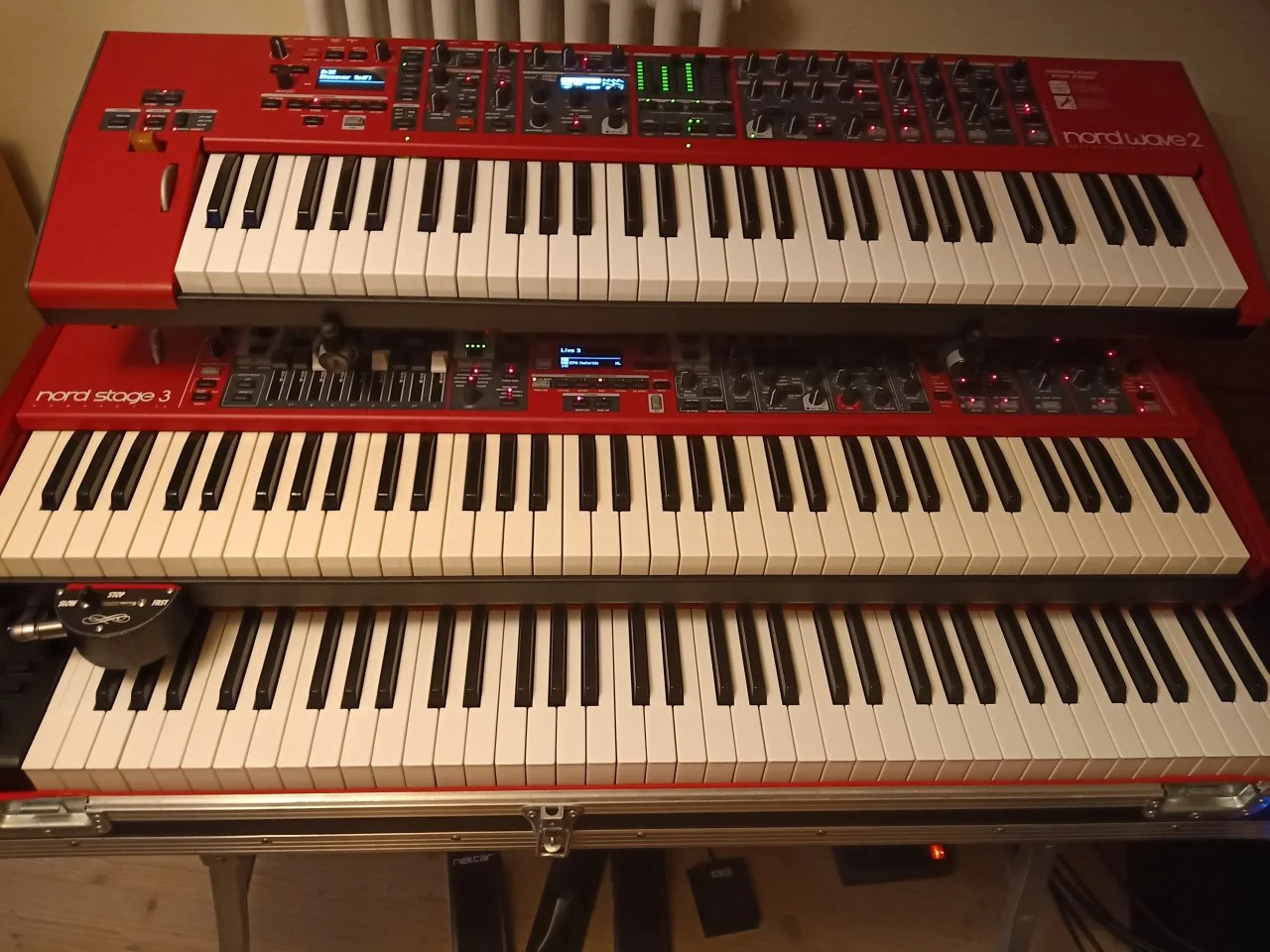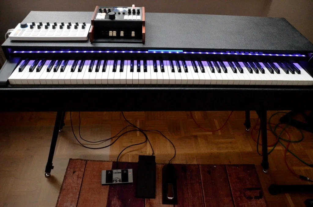 Am iPad ist jetzt ForScore die Haupt-App. Darüber kann das Preset am CP88 gewählt werden. Außerdem habe ich mir zum Leadsheet auch die Audiodatei hinterlegt, die jetzt bequem über den Fußschalter abgespielt werden kann. Als Rhythmus-App probiere ich gerade die "Beat Station" aus. Scheint alles zu können, was ich brauche. Kann auch über den Fußschalter gesteuert werden. Nur zur Preset-Auswahl über MIDI habe ich noch nichts gefunden... Am Airstep habe ich mir drei Presets für das CP88, ForScore und Beat Station gebastelt, die ich mit einem Taster durchschalten kann. Mit diesem Taster nutze ich die Möglichkeiten der Apps jetzt tatsächlich, außerdem hat er weiter zur Reduzierung der Kabel beigetragen...