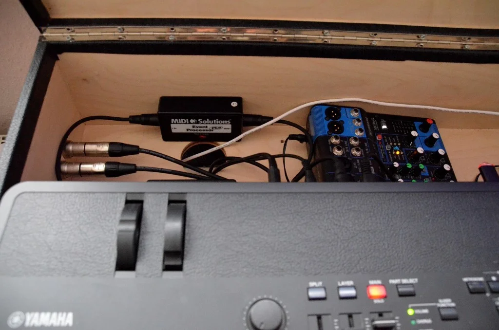 Jetzt hat eine Neuanschaffung mich dazu veranlasst, alles nochmal zu überdenken, und wieder auf das Wesentliche zu reduzieren. Dabei habe ich nicht einmal Funktionalität eingebüßt, eher im Gegenteil. Mit dem Airstep-Lite Bluetooth/MIDI Controller sind Apps auf dem iPad jetzt so gut nutzbar, dass ich das iPad jetzt zur Zentrale gemacht habe, da es als "Notenmappe" eh schon da war. Außerdem kann er gleichzeitig noch als Fußschalter für das CP88 dienen, indem MIDI-PC/CC per MIDI-Flow auf den USB-Anschluss zum CP88 geroutet werden. Man, habe ich jetzt Kabel reduziert...