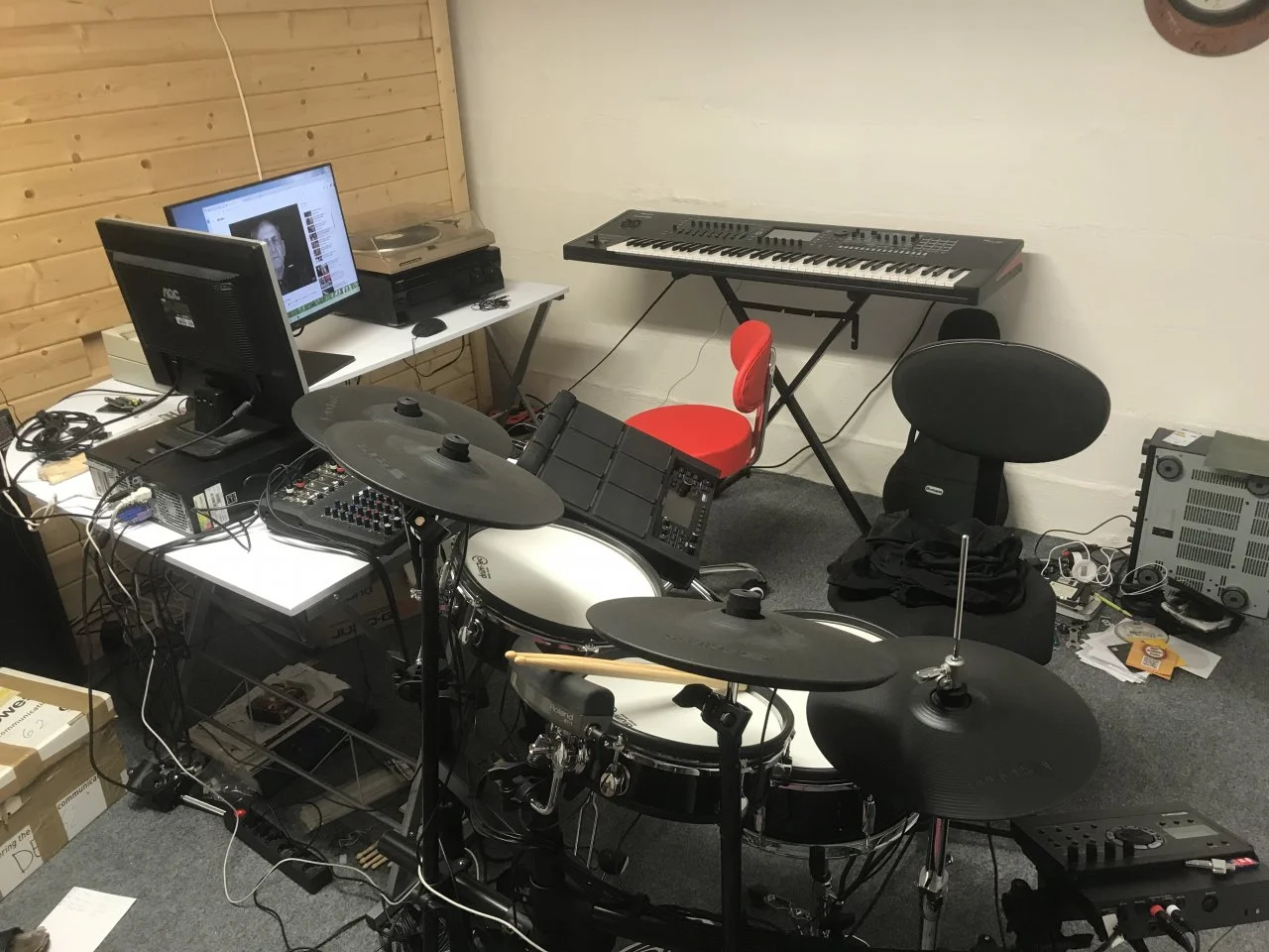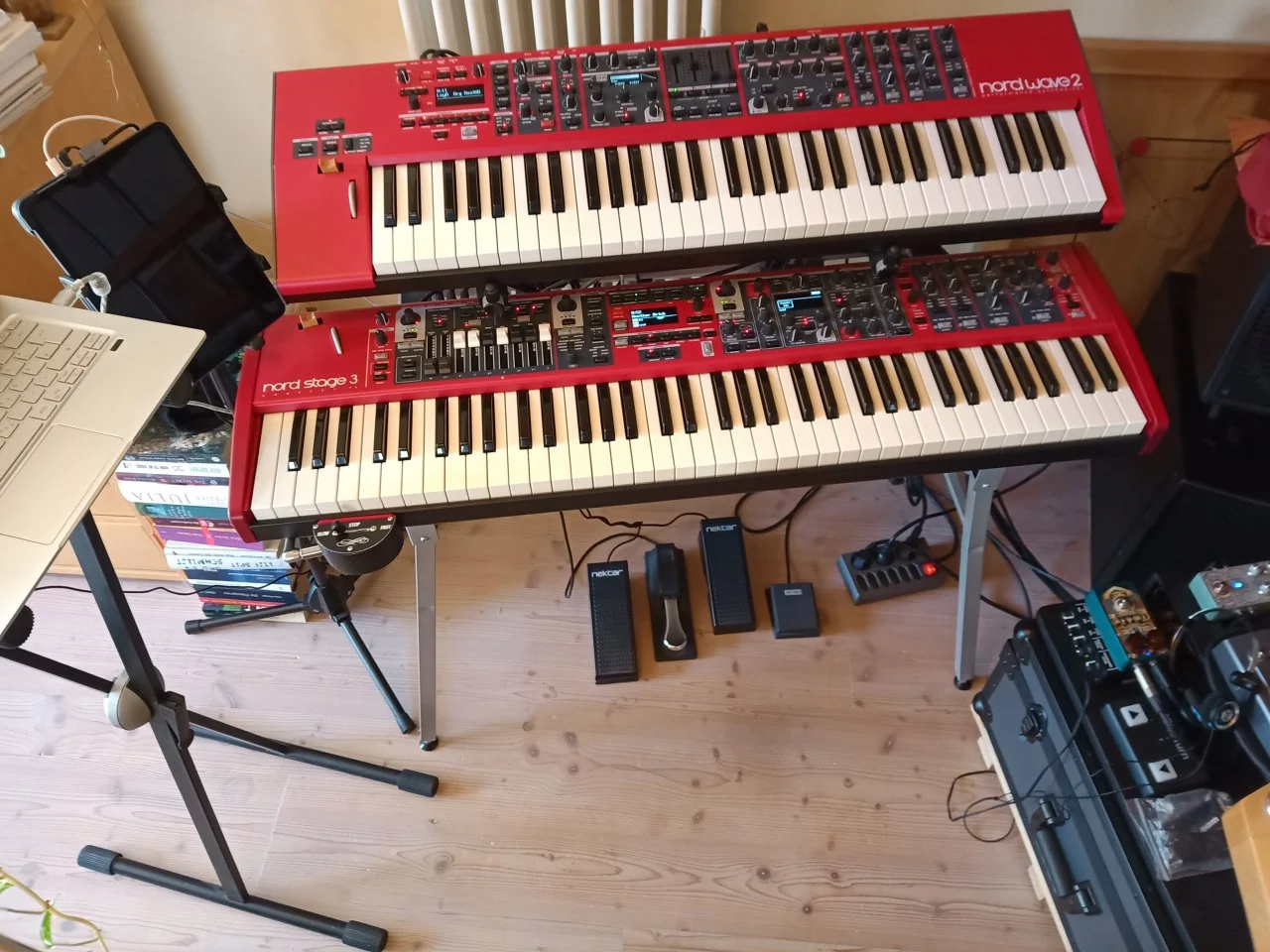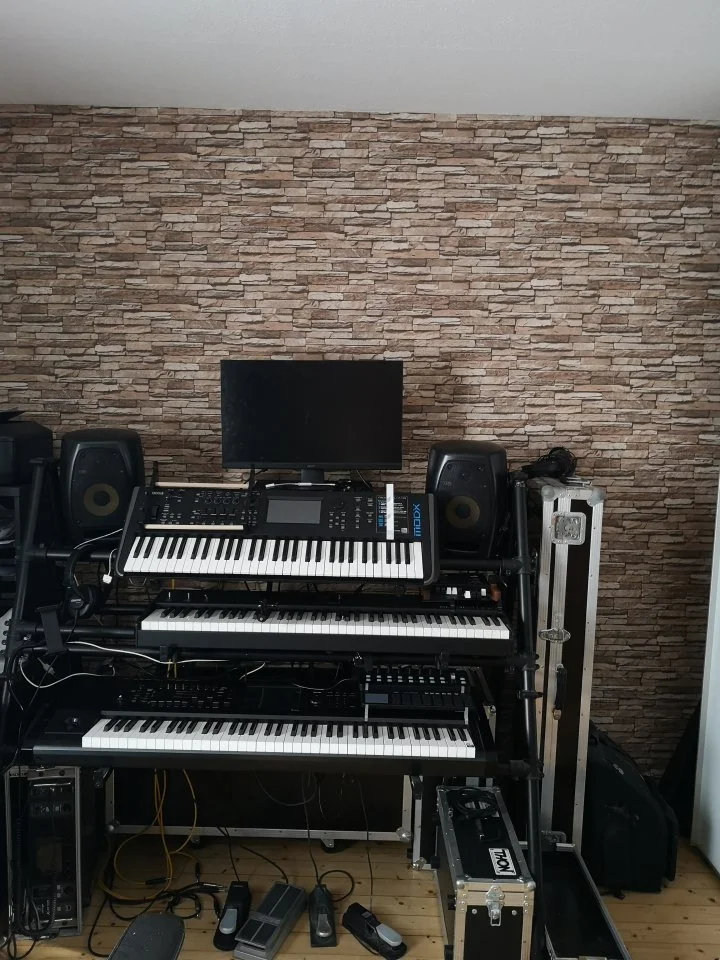 In der Keyboardecke bleibt alles beim neuen alten. Der Kurzweil schickt MIDI ins Interface und damit nach vorne zum Tisch, der Modal bleibt vorerst aussen vor, ist aber auch nur ein Umstecken des C-Kabels aus dem iPad in den Rechner entfernt, genauso wie Midi ausm Kurzweil ins iPad via mioXC. Die Festplatte liegt da glaub ich einfach nur so rum... Audio von beiden Keys plus Helix Stomp für Gitarre/Bass per Submix nach vorne.