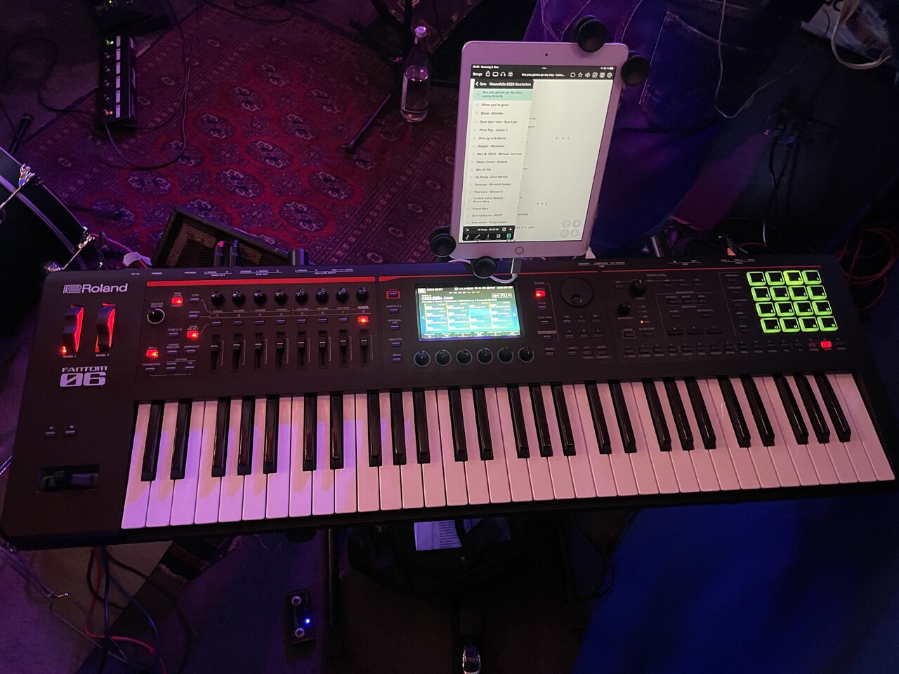 Mein Live-Setup (Cover-Band) vom letzten Wochenende. Die Bühne war ziemlich klein (ca. 3x3m) für 6 Personen und da ich das "one keyboard setup" schon länger ausprobieren wollte, habe ich den Nord Stage, der normalerweise unter den Fantom-06 kommt, einfach weggelassen. Hat gut geklappt, aber ich habe bei der Soundprogrammierung auch schon immer darauf geachtet, dass ich zur Not nur mit dem Fantom auskomme. Bei einigen Piano-lastigen Songs habe ich die gewichtete Tastatur des Nord aber doch ein wenig vermisst...