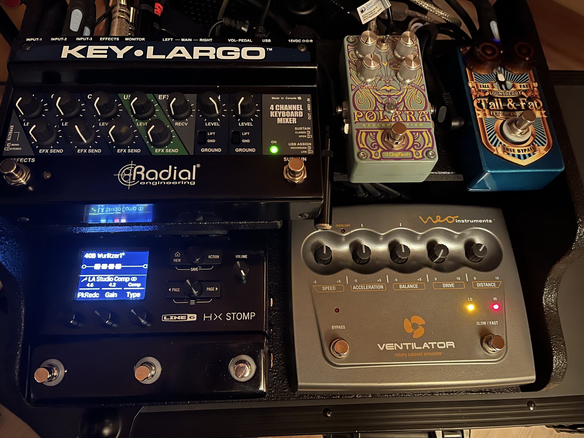 Der ewige Fahrradtaugliche (wobei die Peripherie im Bandbus bzw. mit den Mitmusikern mitfährt). Den Aufbau hab ich vermutlich auch schon mehrfach hier gepostet, die Änderungen liegen im Detail. Der dritte (Latch-) Fusschalter in der Mitte, mit dem (eigentlich gelben) farbigen Kabel, das Upgrade vom kleinen Audiofront Midi Expression mit Stereo-Input auf den I/O mit vier davon (rechts hinterm Interface, falls jemand sucht), das neue Interface (ich geb hier gleichzeitig noch die Clicks aus), der USB-Hub, weil nur zwei Anschlüsse am Macbook Air... Mainstage ist immer noch konkurrenzlos, so sehr ich mich jedesmal drüber ärgere, klanglich hat man mittlerweile alles abgedeckt (eigentlich müsste ich bei den Plugins eher mal durchfegen) und zur Not fährt der ganze Laden seit den M-Prozessoren auch problemlos drei Stunden auf Akku.