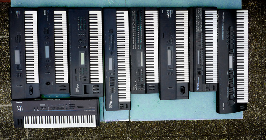 Bei der Zahl der Synthesizer kann ich auch gerade so mithalten, allerdings nur 4 davon mit Tastaturen. Aber ich vermute mal, das BoogieBlaster noch einiges mehr hat, als auf dem Bild zu sehen, und was ich bei anderen schon so gesehen habe, ist meine Sammlung nicht der Rede wert.