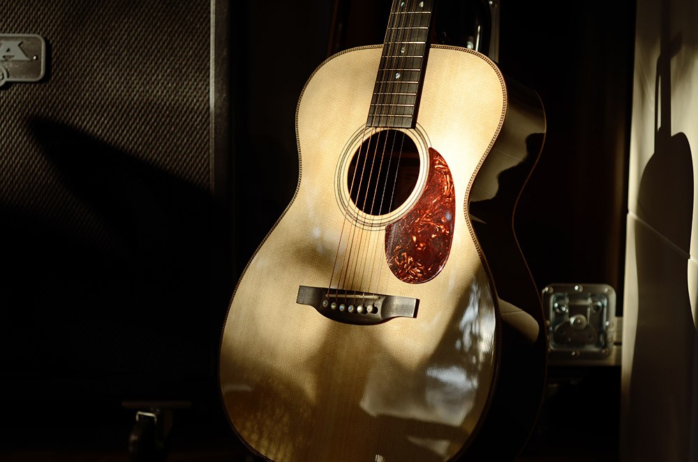 handgebaut in Quebec, Kanada, gebraucht in den USA gekauft, von der Post versehentlich nach Australien anstatt Östereich geschickt, und die letzten 2 Wochen beim Zollamt in Wien verbracht.. aber jeder Tag des wartens und der Geduld beweisen hat sich gelohnt, sie klingt einfach Traumhaft, eine Boucher Indian Goose Studio OM: