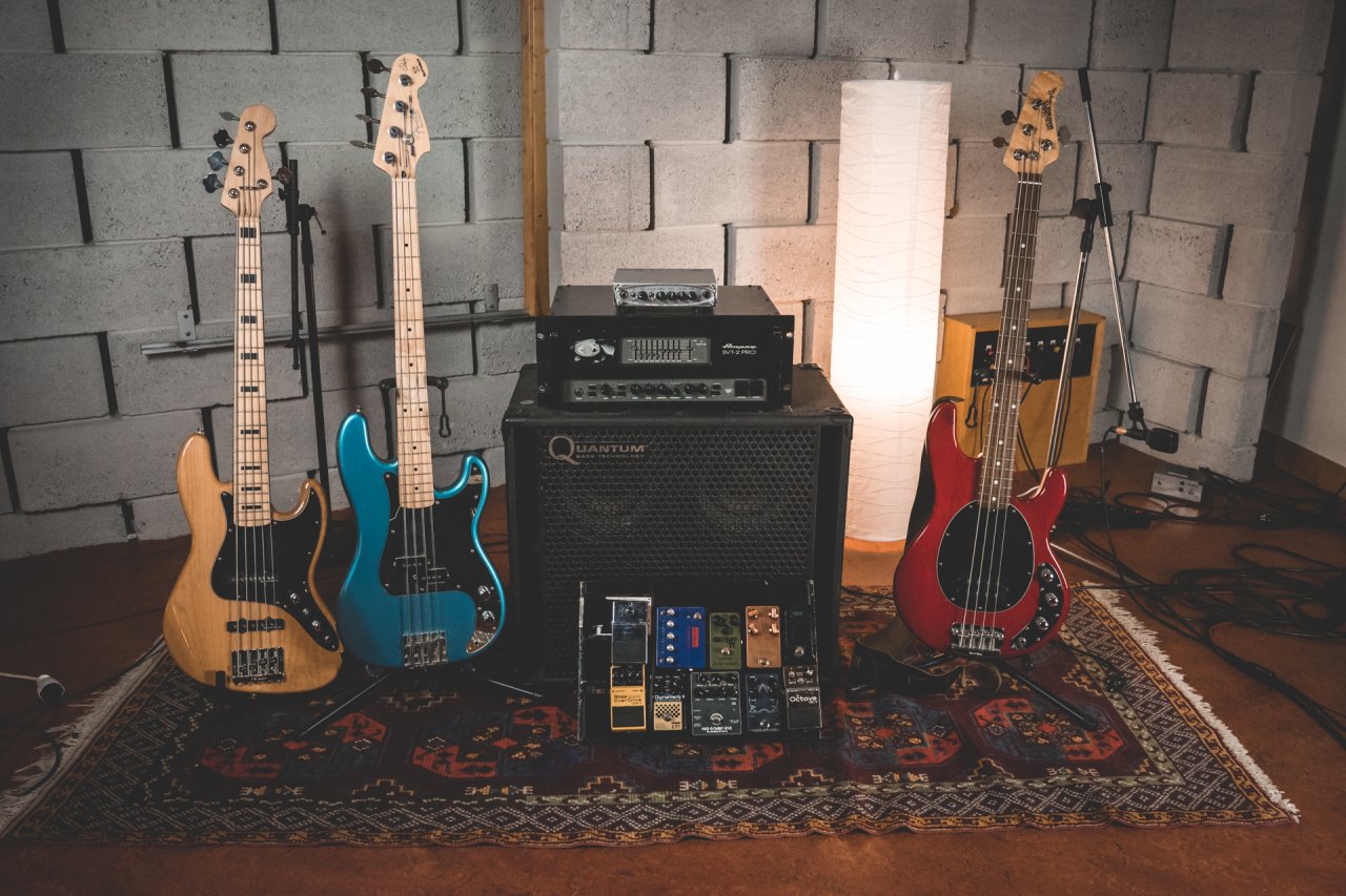 Zu sehen v.l.n.r.: Squier Vintage Modified Jazz Bass V mit Seymour Duncans und Fender Hi-Mass Bridge, Steve Harris P-Bass mit Flats (leider vom Studiobesitzer, brauch so ein Teil), Musicman Stingray, 97er baujahr mit 2-band EQ den ich seit mittlerweile fast 10 Jahren mein eigen nenne.
