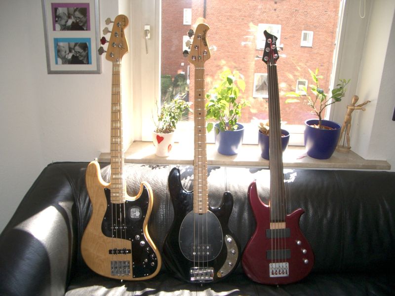 v.l.n.r.: Fender Marcus M. Signature, MusicMan Stingray MM20, Palmer B-05