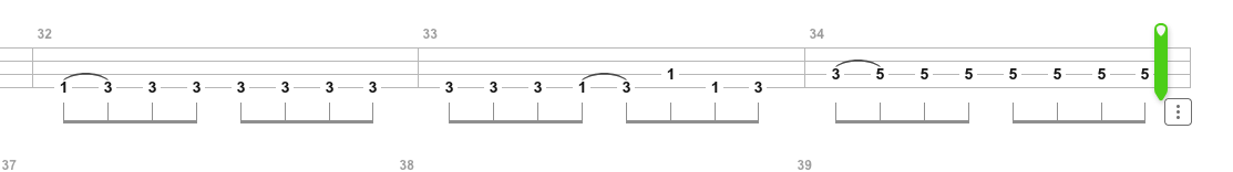 Die Bindebögen: Spiele ich die grundsätzlich als slides oder als Hammer-Ons? Instinktiv würde ich z.B. in Takt 32 einen Hammer-On machen, ebenso in 33 und bei 34 dann mit dem kleinen Finger auf die 5 sliden.