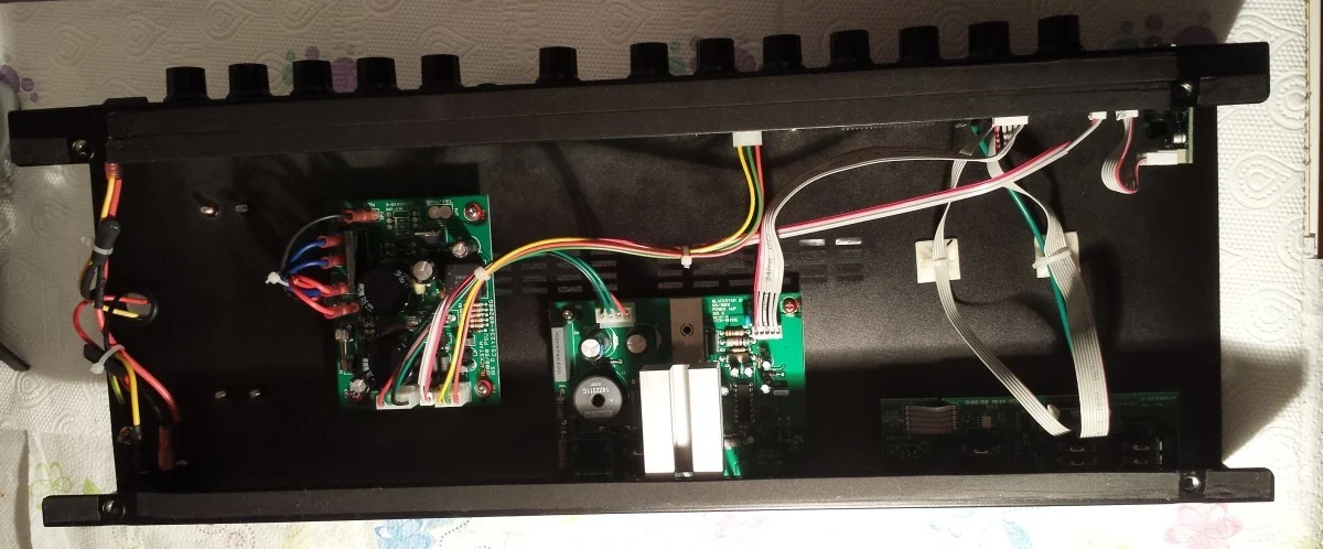 Es handelt sich um eine Class-D-Endstufe, deshalb reicht der recht kleine Kühlkörper auch aus. Bei der 100W-Version (gleiche Platine) ist dann der Kühlkörper wohl größer und nimmt die ganze Breite ein. Wenn ich mich recht entsinne, wird eine Kombination aus IRS2092 und IRFI4019 verwendet.