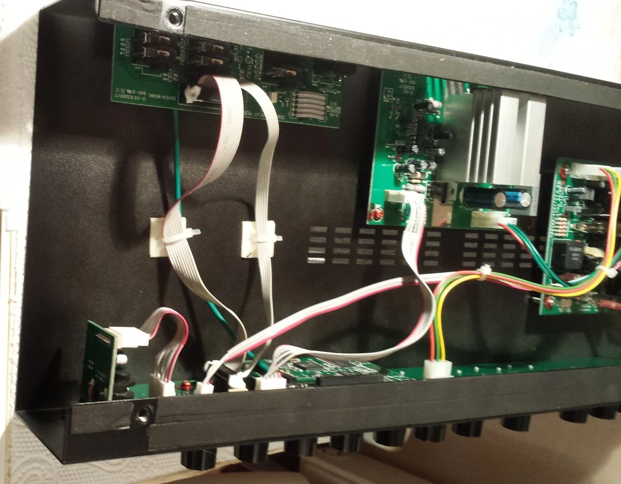 Insgesamt macht alles einen ordentlichen Eindruck. Es sind hochwertige Epoxid-Platinen verbaut, der Aufbau und die Verkabelung ist sauber. Die Buchsen machen auch einen brauchbaren Eindruck, sie sind vom Aufbau der Neutrik M-Serie ähnlich. Für den Lautsprecheranschluß wäre natürlich eine Speakonbuchse eine bessere Lösung gewesen, da muss man dann auch keine Angst um Kurzschlüsse beim Herausziehen des Steckers im laufenden Betrieb haben.
