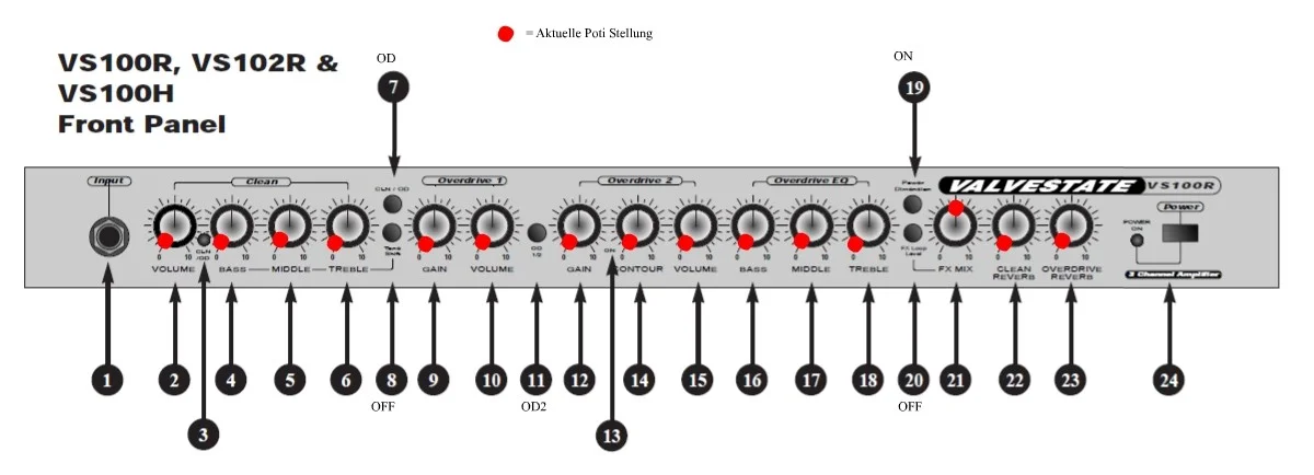 Alle Potis auf "Off" ausser dem FX Mix Regler welcher auf 12 Uhr steht. Ihr könnt die genaue Poti und Schalterstellung in dem Bild sehen, welches ich angehängt habe.
