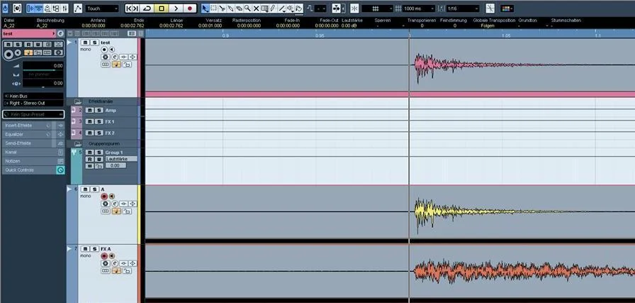 Um zu schauen ob vielleicht Latenzproblem dahinter stecken, habe ich einfach mal einen Klickersound aufgenommen (die oberste, pink gefärbte Spur "test", siehe Abbildung 1). Dieses Signal habe ich dann über einen Ausgang meiner Soundkarte geschickt und von dort direkt wieder in einen Eingang geleitet und auf die gelb gefärbte Spur "A" gelegt. Von dort ausgehend wird das Signal in mehreren Schritten bearbeitet (so wie ich normalerweise bei Gitarrenaufnahmen verfahre):
