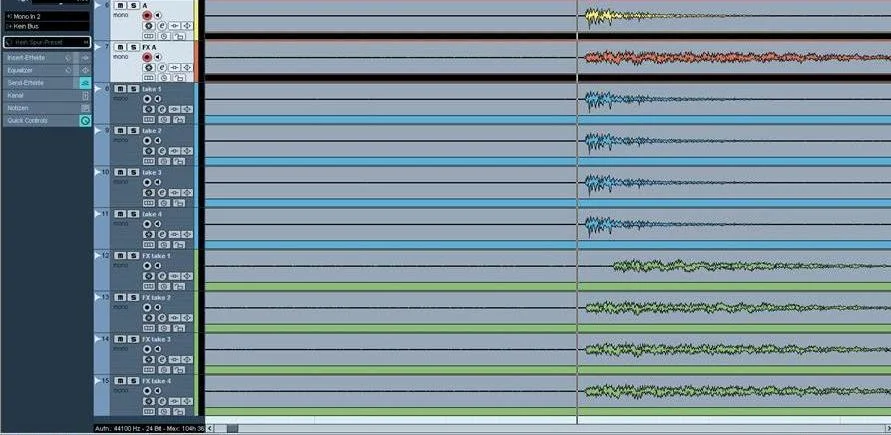 Wiederhole ich mehrere Aufnahmen mehrmals hintereinander (wobei ich nach jeder Aufnahme die aufgezeichneten Spuren dupliziere und umbenenne), so mach ich die verwirrende Beobachtung, dass immer bei der ersten Aufnahme, das prozessierte Signal um ca. 12 ms versetzt ist (siehe in der Abbildung die oberste grüne Spur "FX take1").