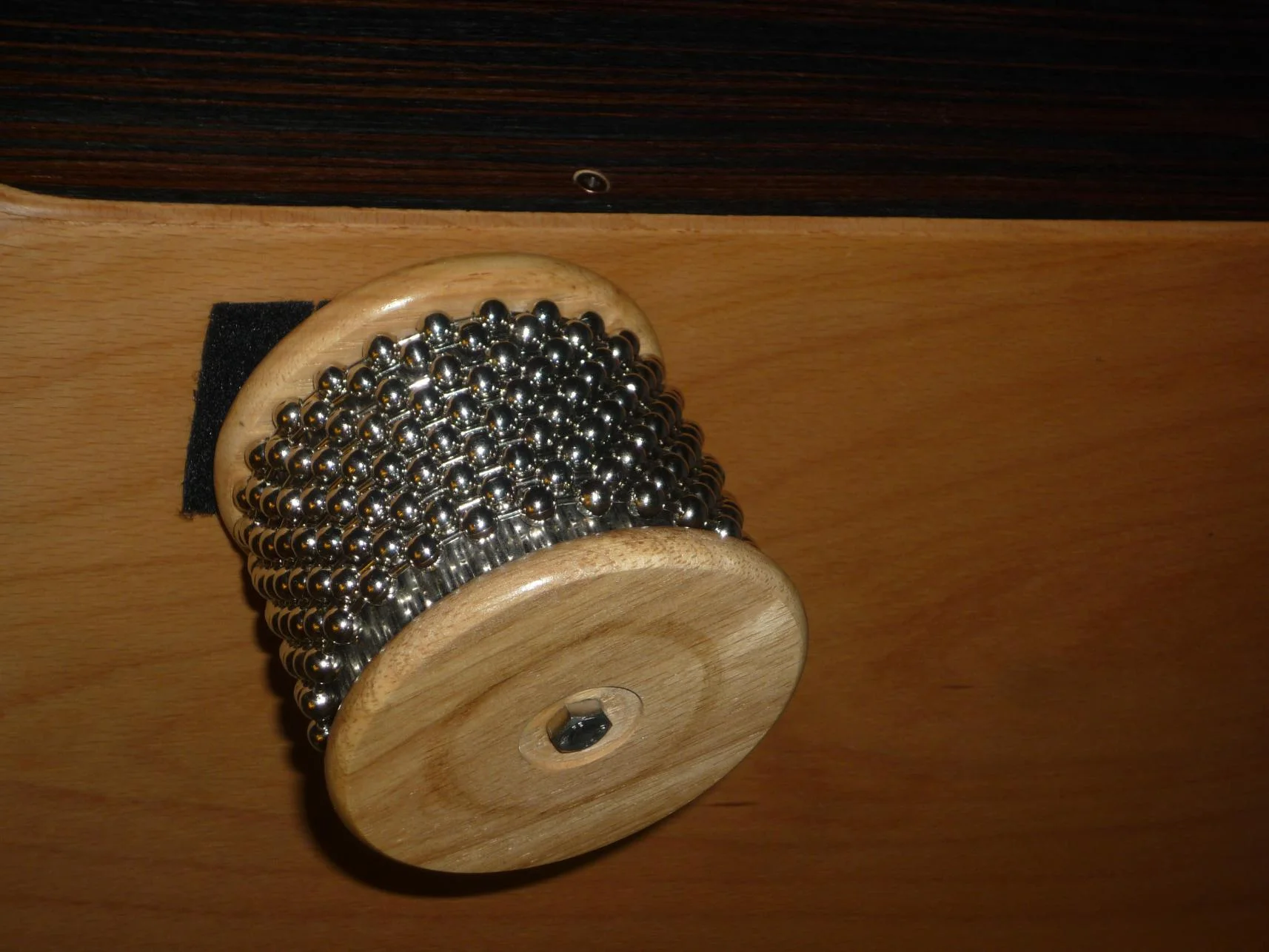 Ich hab neulich ein Youtube-Video gesehen (http://www.youtube.com/watch?v=Yt_hX4vc70o), in dem der Cajon-Spieler eine Cabasa an seine Cajon gebaut hatte. Die Idee fand ich echt super, drum hab ich mir mal ne gĂŒnstige Cabasa bestellt, den Griff abgeschraubt, stattdessen eine lange Maschinenschraube eingesetzt, damit das gute Teil nicht auseinander fliegt, und das ganze Teil mit Klettband ausm Baumarkt an meiner Cajon befestigt.