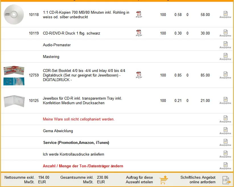 Soweit ich informiert bin, rechnet sich das "pressen lassen" erst ab Stückzahlen von 300 aufwärts, da ein Glasmaster angefertigt werden muss usw. Jetzt habe ich von Hofa Media ein Angebot entdeckt, welche mir CDs auch in kleiner Stückzahl kopieren und sogar bedrucken können. Hier eine Zusammenstellung in S/W Druck auf CD, farbigem 4-seitigen Cover und Inlay.