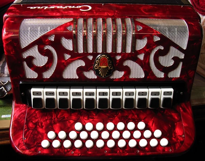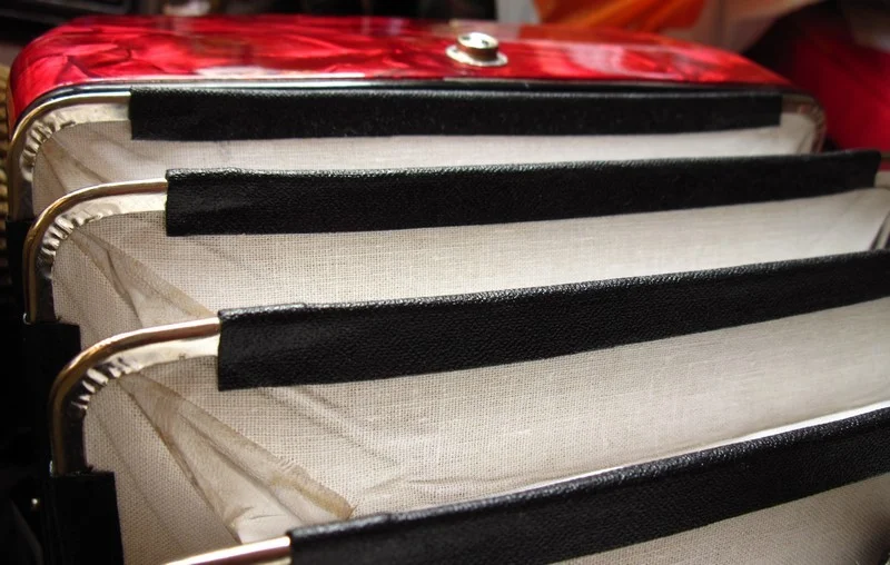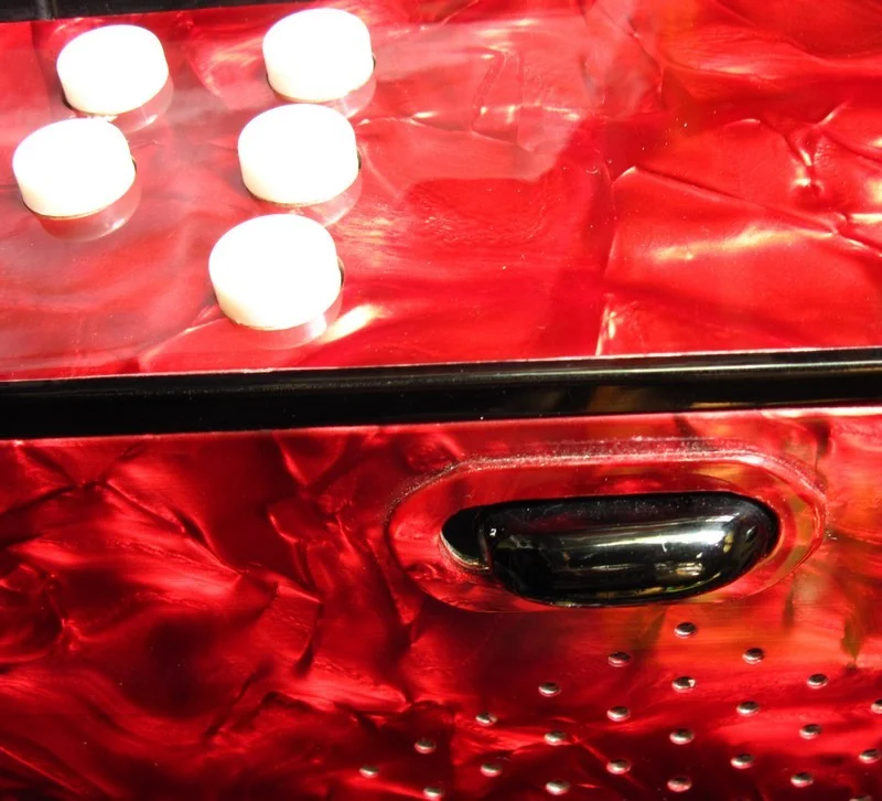 Der Balg ist weiß und sauber, die Kalikostreifen sind wie neu trotz fehlenden Balgschutzes (kein Wunder), die Balgecken sind nicht angelaufen und auch die anderen Metall- oder Blechteile sind blank, die Knöpfe (Diskant und Bass) sind angenehm zu drücken, das hörbare Klacken nur gering.