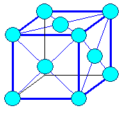So sieht ungefähr eine kubisch flächenzentrierte Elementarzelle aus: 8 Kupferatome auf den Ecken und 6 auf den Würfelflächen ( Eigentlich 8 x 1/4 Kupferatome auf den Ecken und 6 x 1/2 Kupferatome auf den Würfelflächen ).