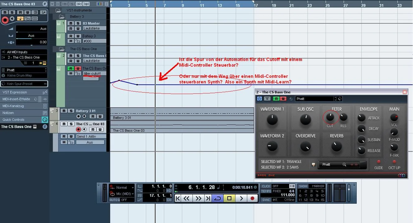 Mit dem Mauspfeil während Song abspielt Cutoff an dem Synthesizer verändern durch am Knopf drehen, und das ganze gleichzeitig aufnehmen.