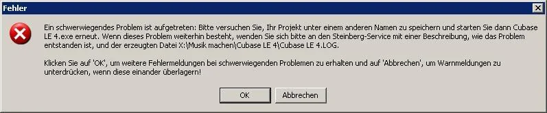 Ich benutze Cubase LE 4 mit Windows XP und sobald ich eine Audio-Spur normalisieren moechte, erscheint folgende Fehlermeldung. Dabei muss das Projekt unter einem neuen Namen gespeichert werden, da das "Systen nicht mehr stabil läuft". Woran kann das liegen? Ich bin mir nicht ganz sicher, aber ich meine in Cubase LE 4 auch schon normalisiert zu haben, ohne dass diese Fehlermeldung kommt.