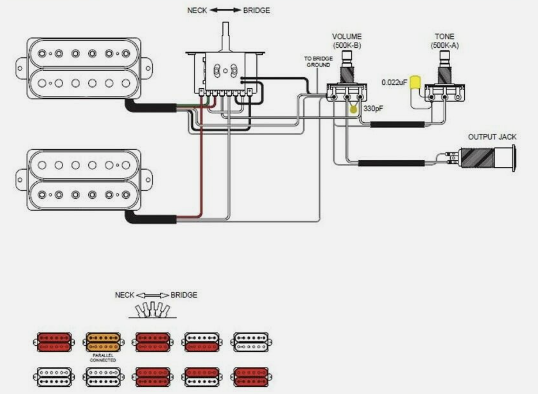Soweit ich herausfinden konnte ist die angehängte Schema die Ibanez Standard für 5-Weg HH. Soweit so gut. Würde mir notfalls auch reichen, aber könnte ich auf Position 4 (glaube nicht dass ich Neck PU in parallel brauche, wofür ist das gut?) es so verkabeln, dass 4 eine Art wildes Feedback-Signal erzeugt? Ich spiele Metal und möchte eine Position die mir Chaos gibt. Oder eine Art geheimes Killswitch?